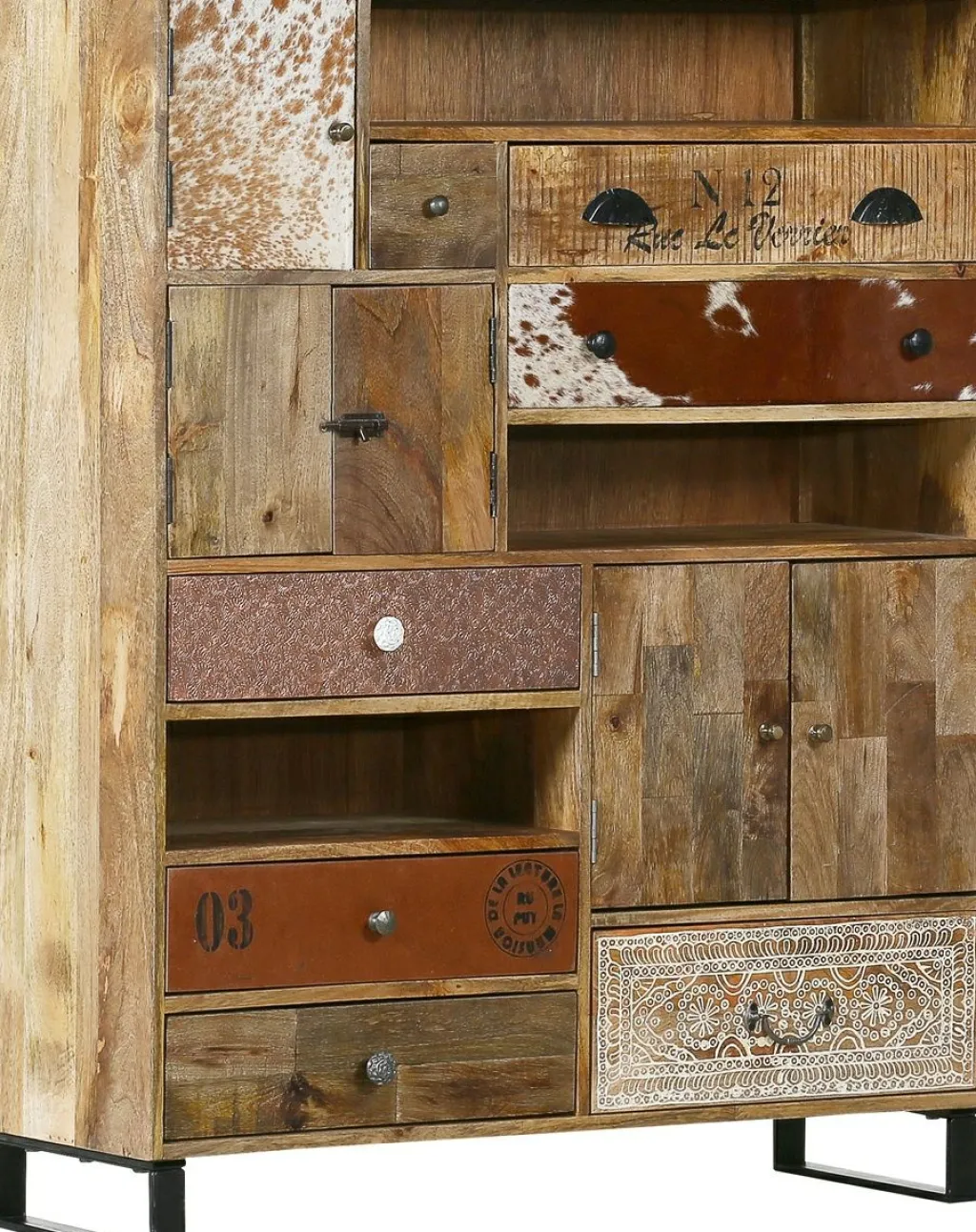 Façades : bois de manguier massif (Asie), teinté et laqué avec peau de chèvre, ciselages minutieux et un panneau de cuivre