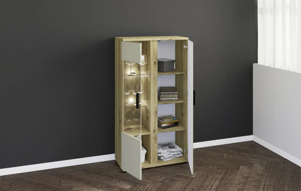 Façade : cachemire avec contrastes décor chêne Artisan, panneau de particules surfacé et mélaminé (PPSM) / verre