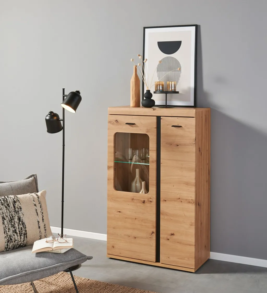 Façade : décor chêne Artisan, MDF (panneau de fibres de bois de densité moyenne) pelliculé avec contrastes ton noir (panneaux de particules mélaminés) / verre