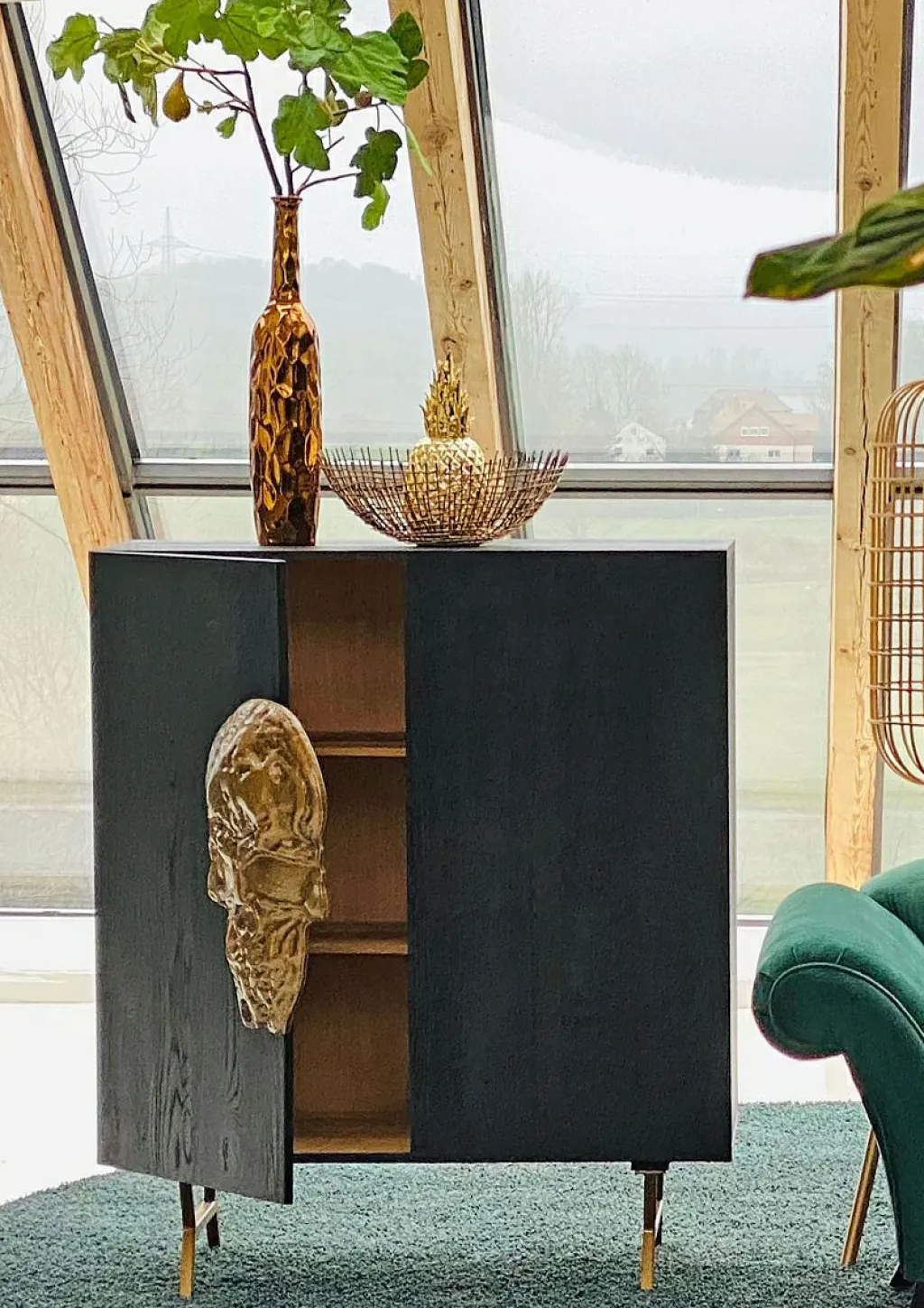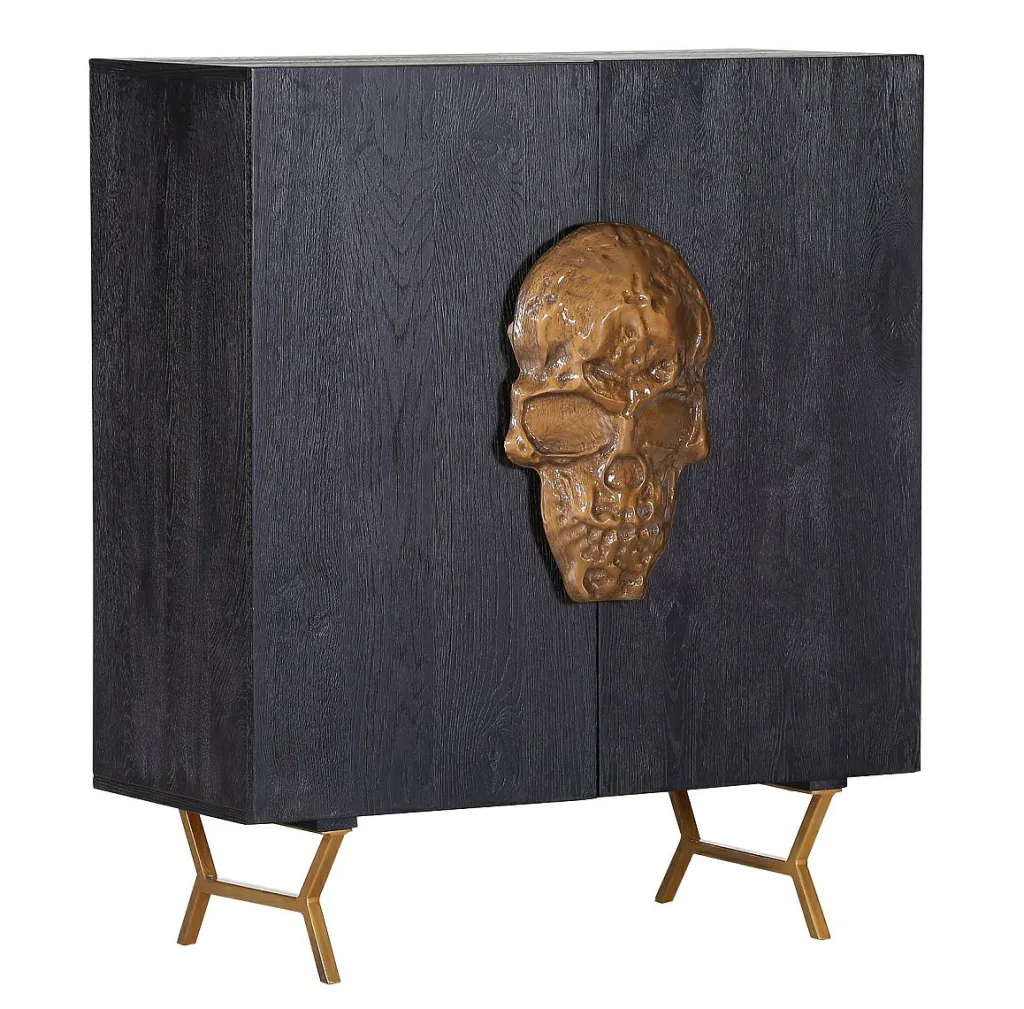 Poignées en forme de tête de mort en bois de manguier massif (Inde), ton doré laqué aspect brillant