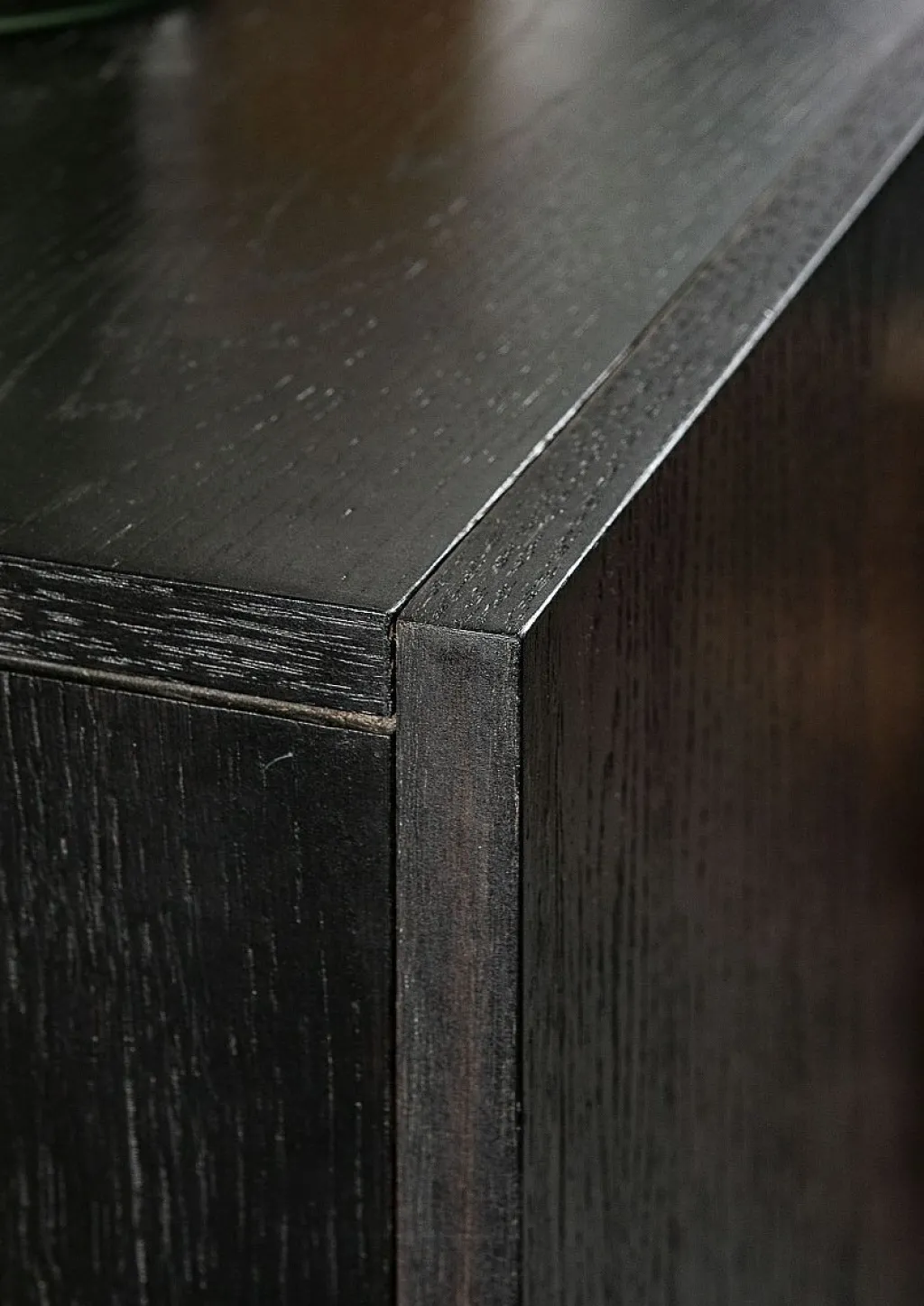 Caisson et façade : placage en chêne véritable (Inde) teinté en noir et laqué