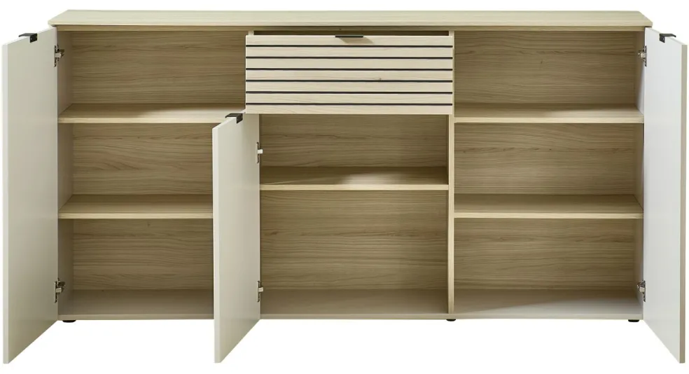 Façade : MDF (panneau de fibres de bois de densité moyenne) ton cachemire et contrastes MDF décor chêne Riva aspect lattes de bois