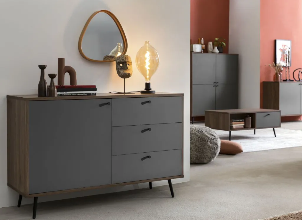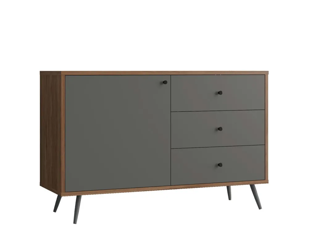 Caisson et façade : MDF ( panneaux de fibres de bois de moyenne densité) avec revêtement mélaminé ton noyer et gris