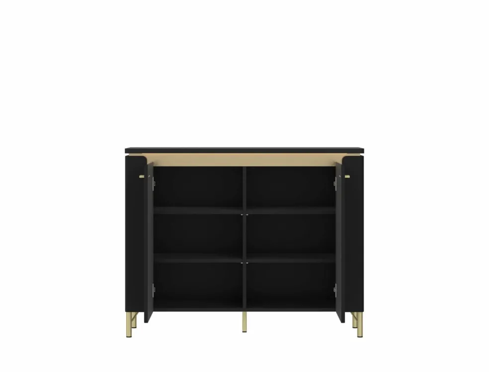 Caisson : ton noir et contrastes ton doré, plateau en MDF, panneau de particules surfacé mélaminé (PPSM)