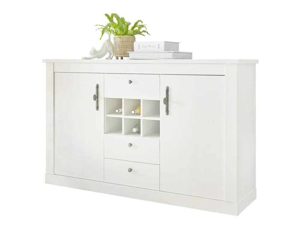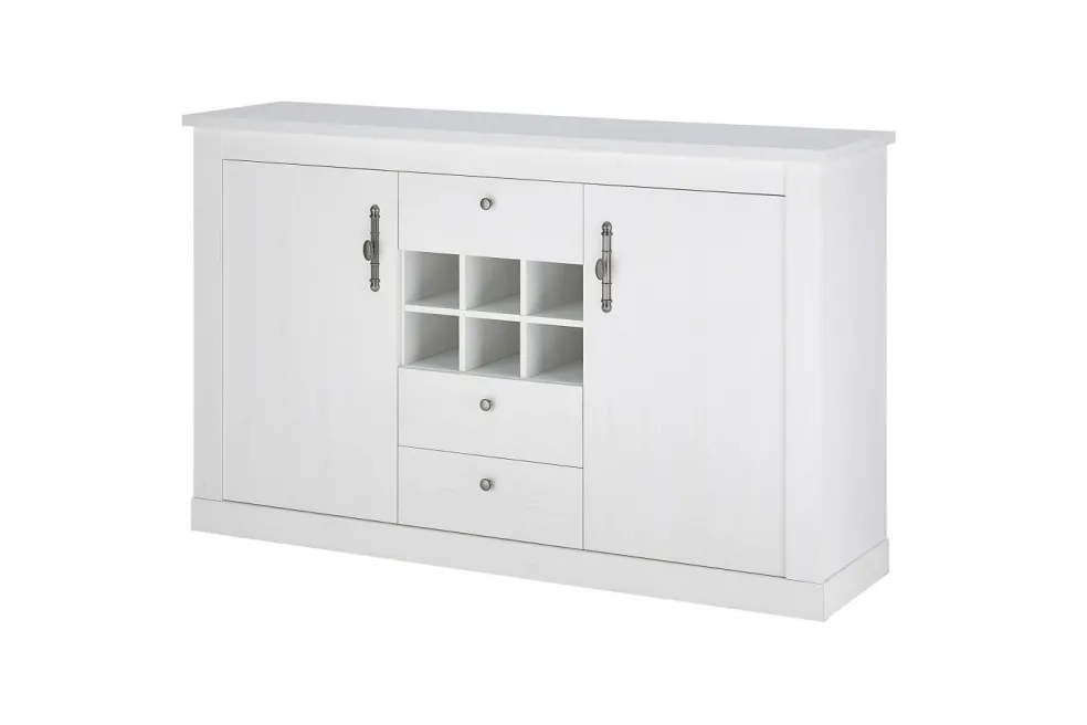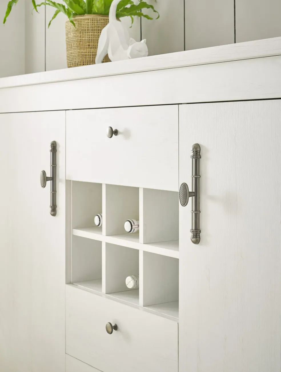 Au centre : 3 tiroirs et 1 rangement pour bouteilles avec 6 casiers