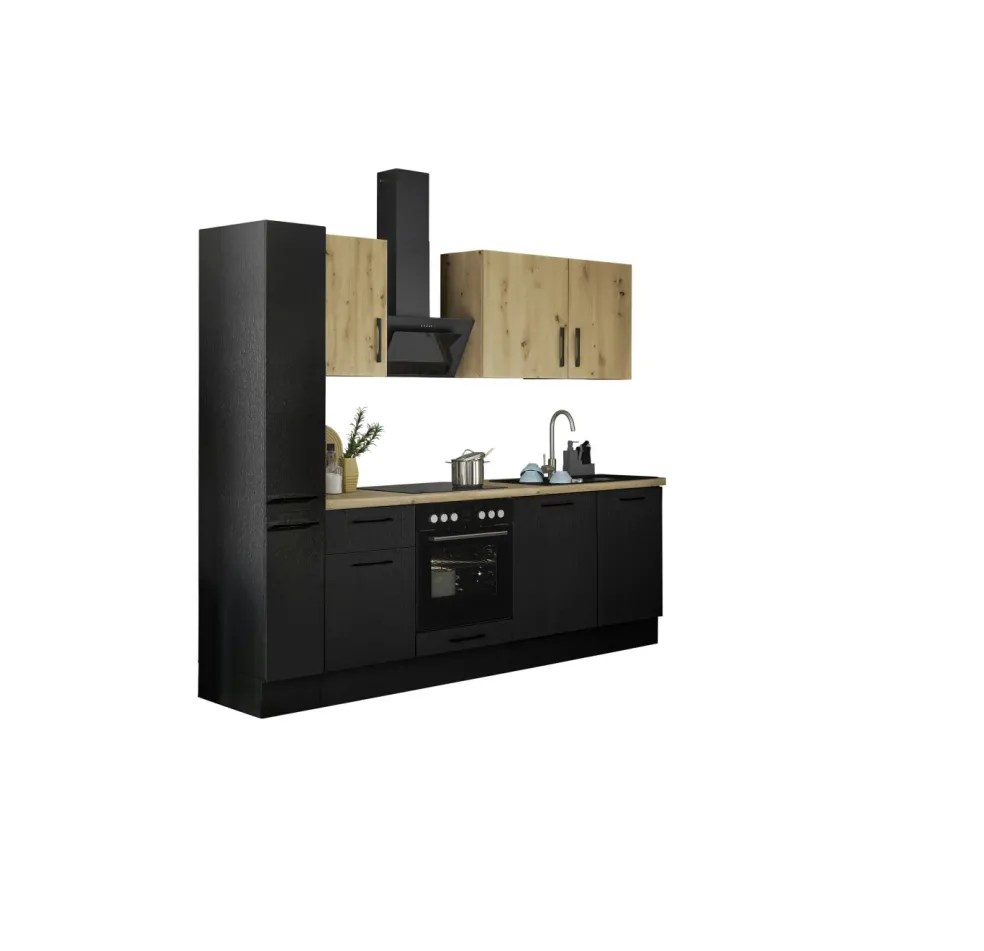 Façade et caisson : imprimé bois (woodprint) ton noir et panneau de particules surfacé mélaminé (PPSM) décor chêne Artisan