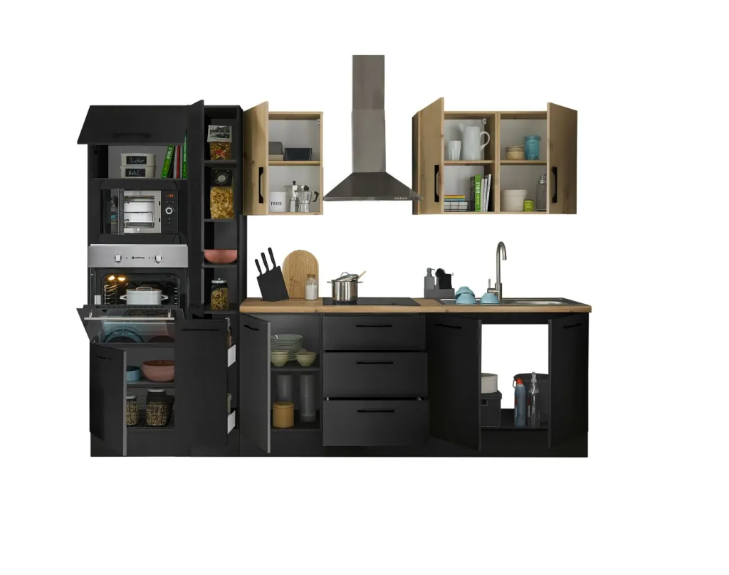 Façade et caisson : imprimé bois (woodprint) ton noir et panneau de particules surfacé mélaminé (PPSM) décor chêne Artisan