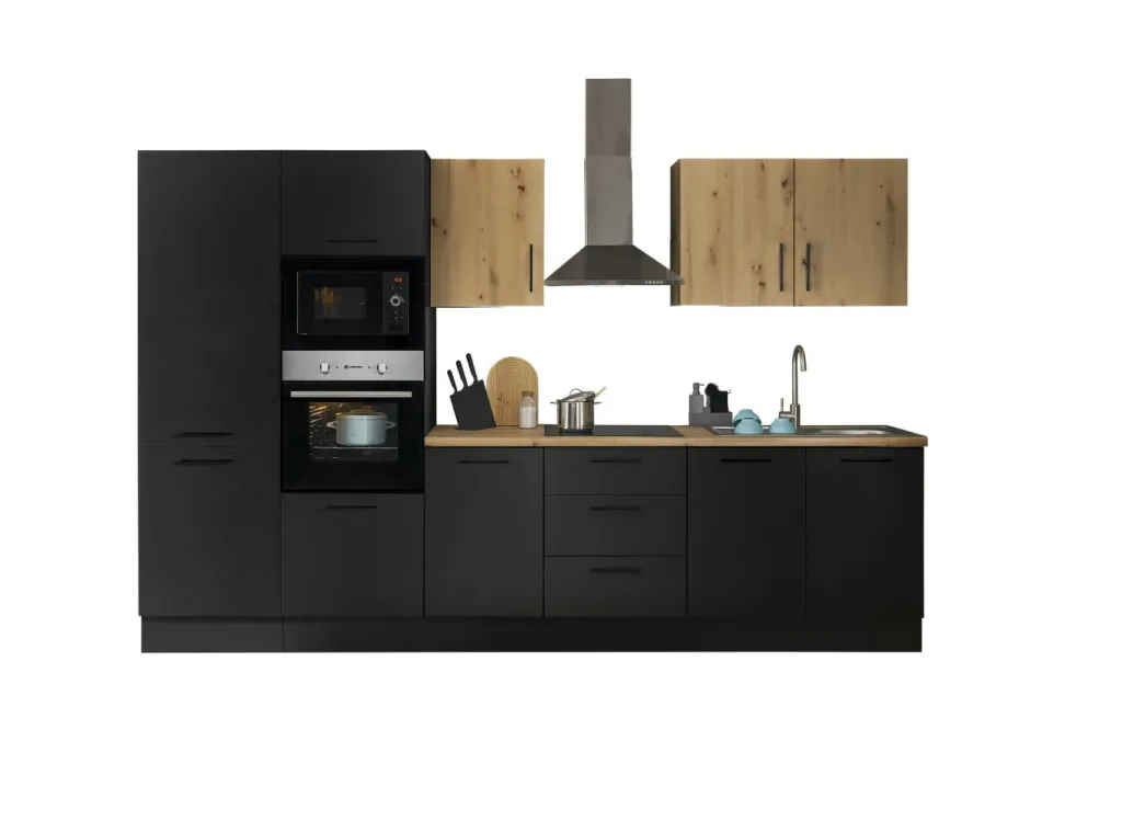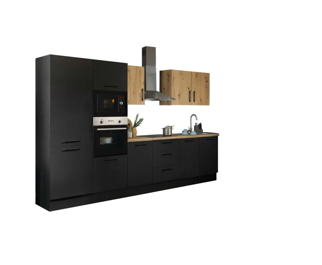 Façade et caisson : imprimé bois (woodprint) ton noir et panneau de particules surfacé mélaminé (PPSM) décor chêne Artisan