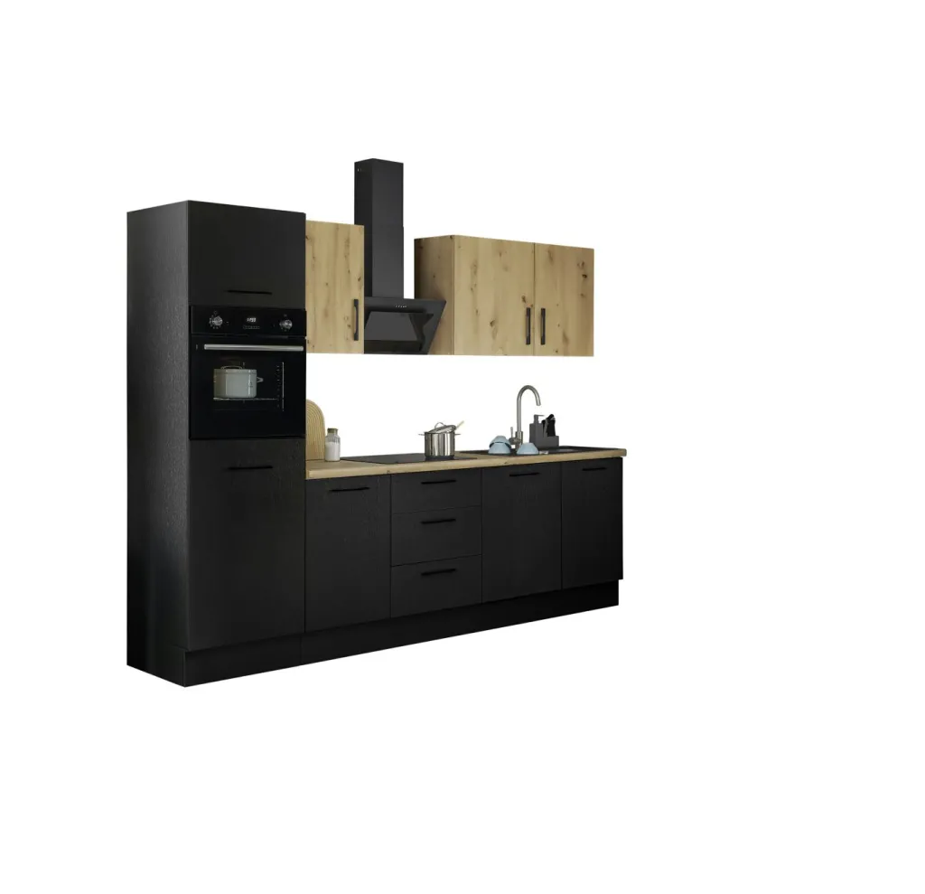 Façade et caisson : imprimé bois (woodprint) ton noir et panneau de particules surfacé mélaminé (PPSM) décor chêne Artisan