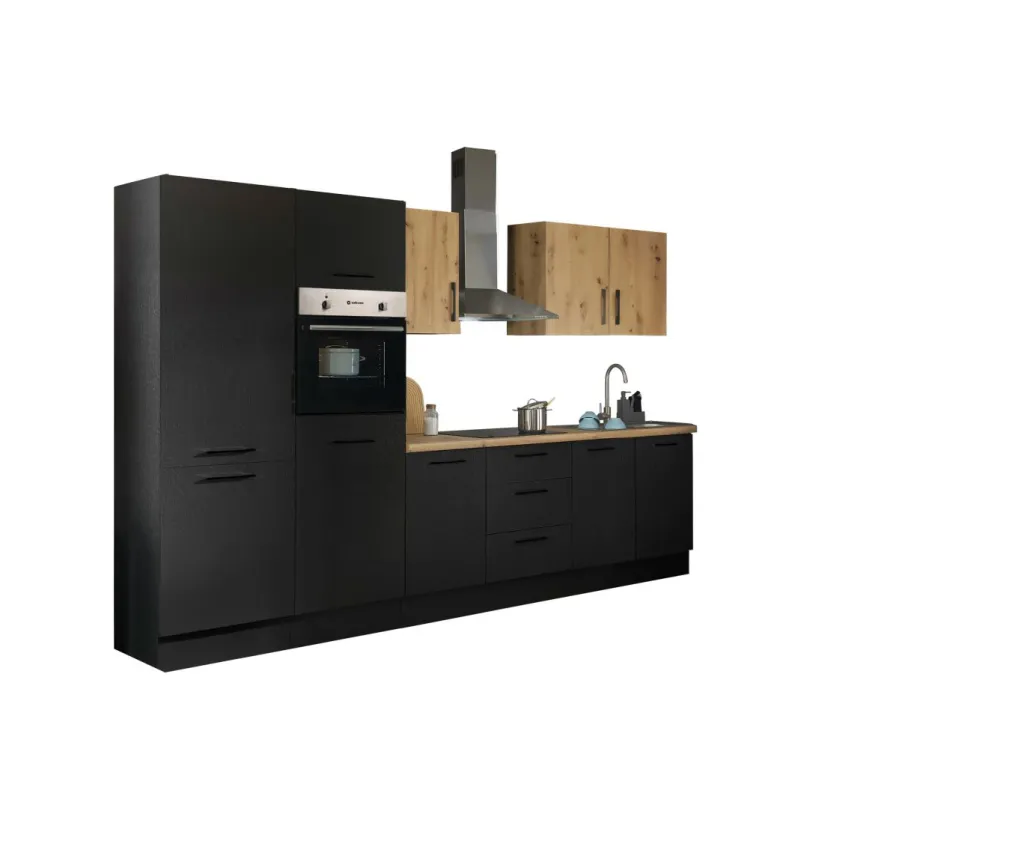 Façade et caisson : imprimé bois (woodprint) ton noir et panneau de particules surfacé mélaminé (PPSM) décor chêne Artisan
