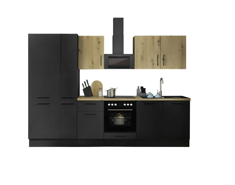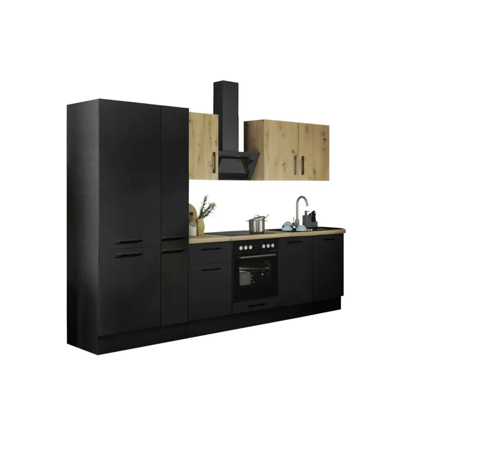 Façade et caisson : imprimé bois (woodprint) ton noir et panneau de particules surfacé mélaminé (PPSM) décor chêne Artisan