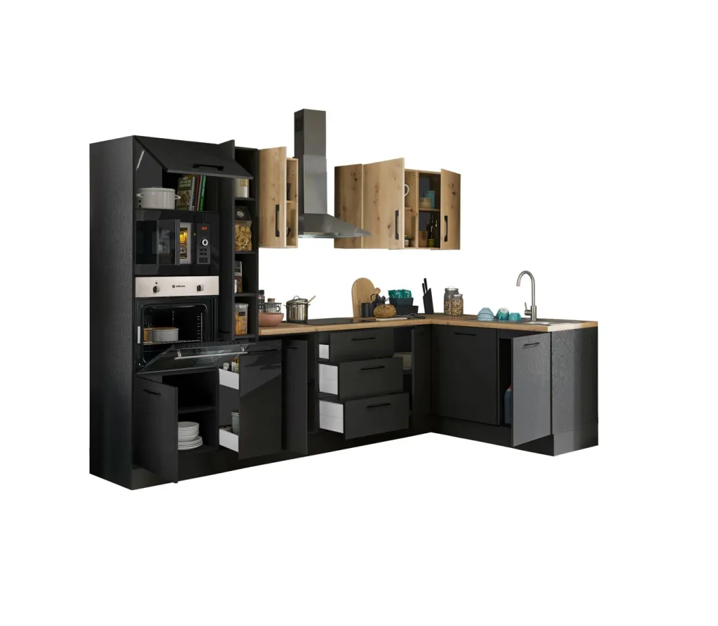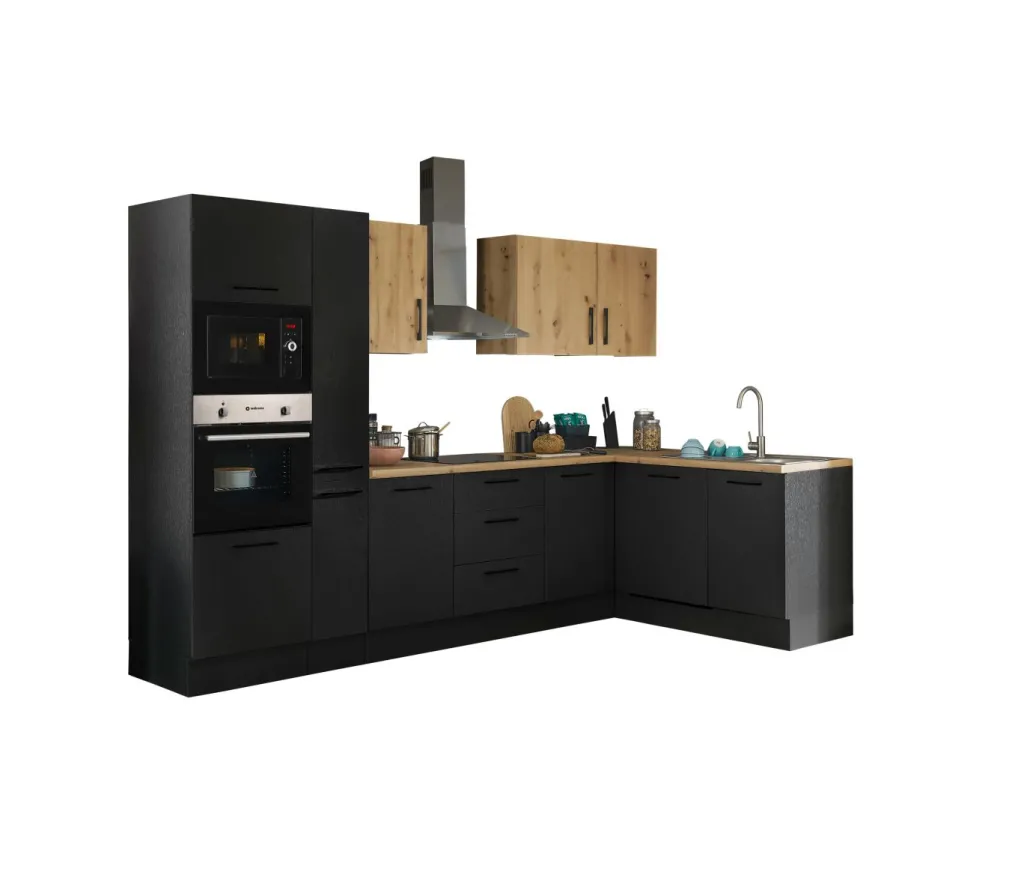 Façade et caisson : imprimé bois (woodprint) ton noir et panneau de particules surfacé mélaminé (PPSM) décor chêne Artisan