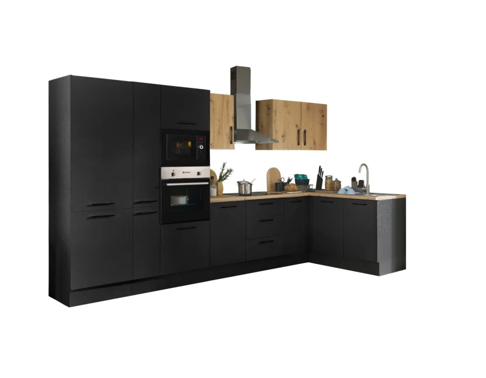 Façade et caisson : imprimé bois (woodprint) ton noir et panneau de particules surfacé mélaminé (PPSM) décor chêne Artisan