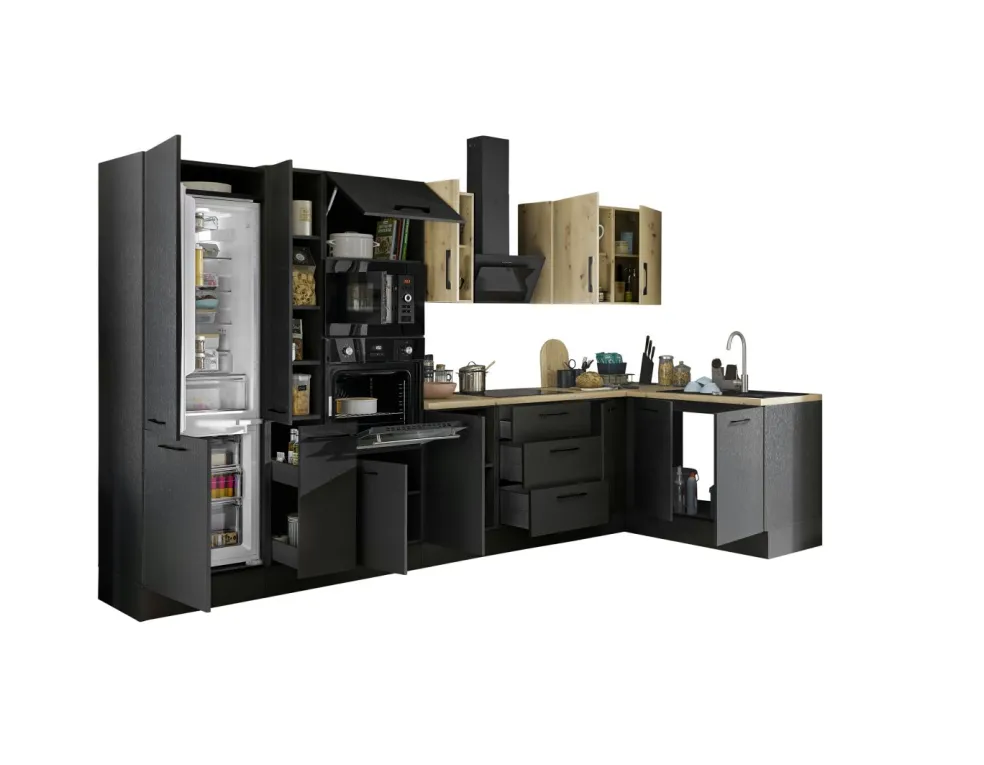 Façade et caisson : imprimé bois (woodprint) ton noir et panneau de particules surfacé mélaminé (PPSM) décor chêne Artisan