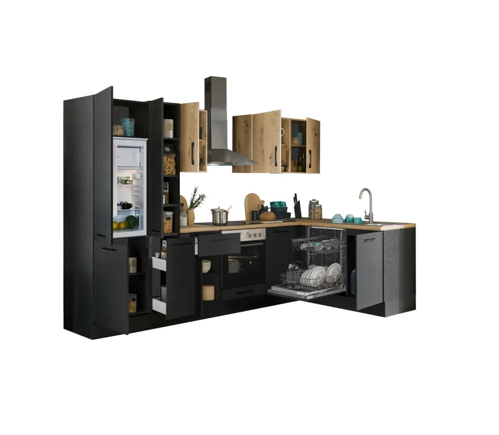 Façade et caisson : imprimé bois (woodprint) ton noir et panneau de particules surfacé mélaminé (PPSM) décor chêne Artisan