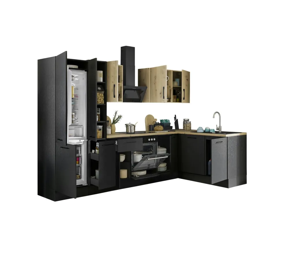Façade et caisson : imprimé bois (woodprint) ton noir et panneau de particules surfacé mélaminé (PPSM) décor chêne Artisan