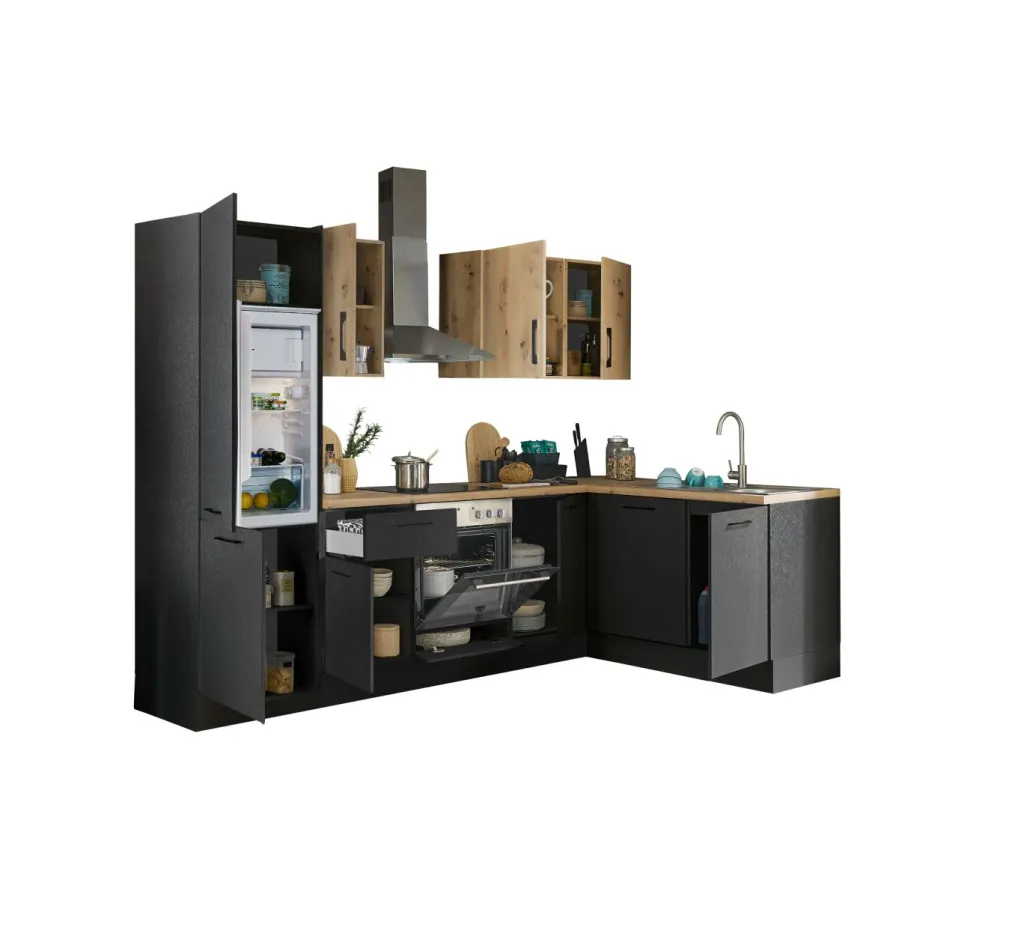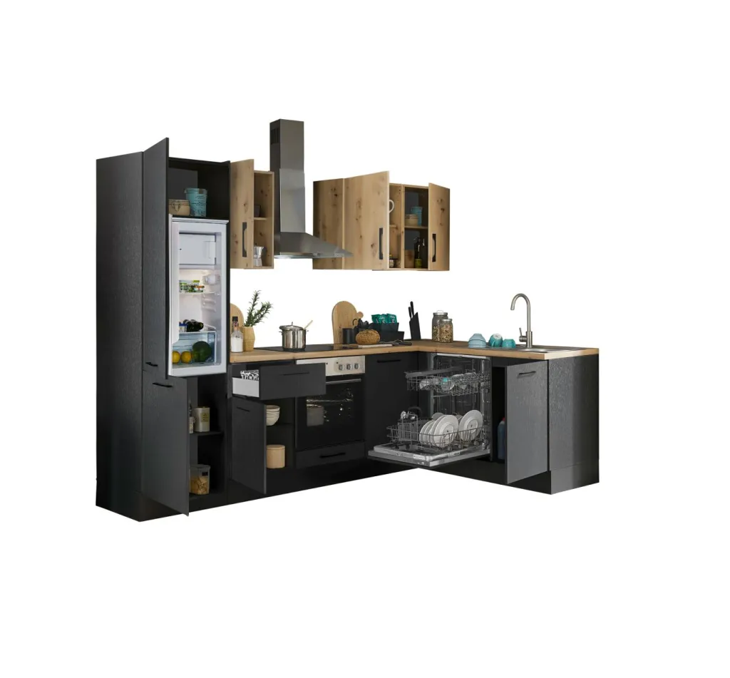 Façade et caisson : imprimé bois (woodprint) ton noir et panneau de particules surfacé mélaminé (PPSM) décor chêne Artisan