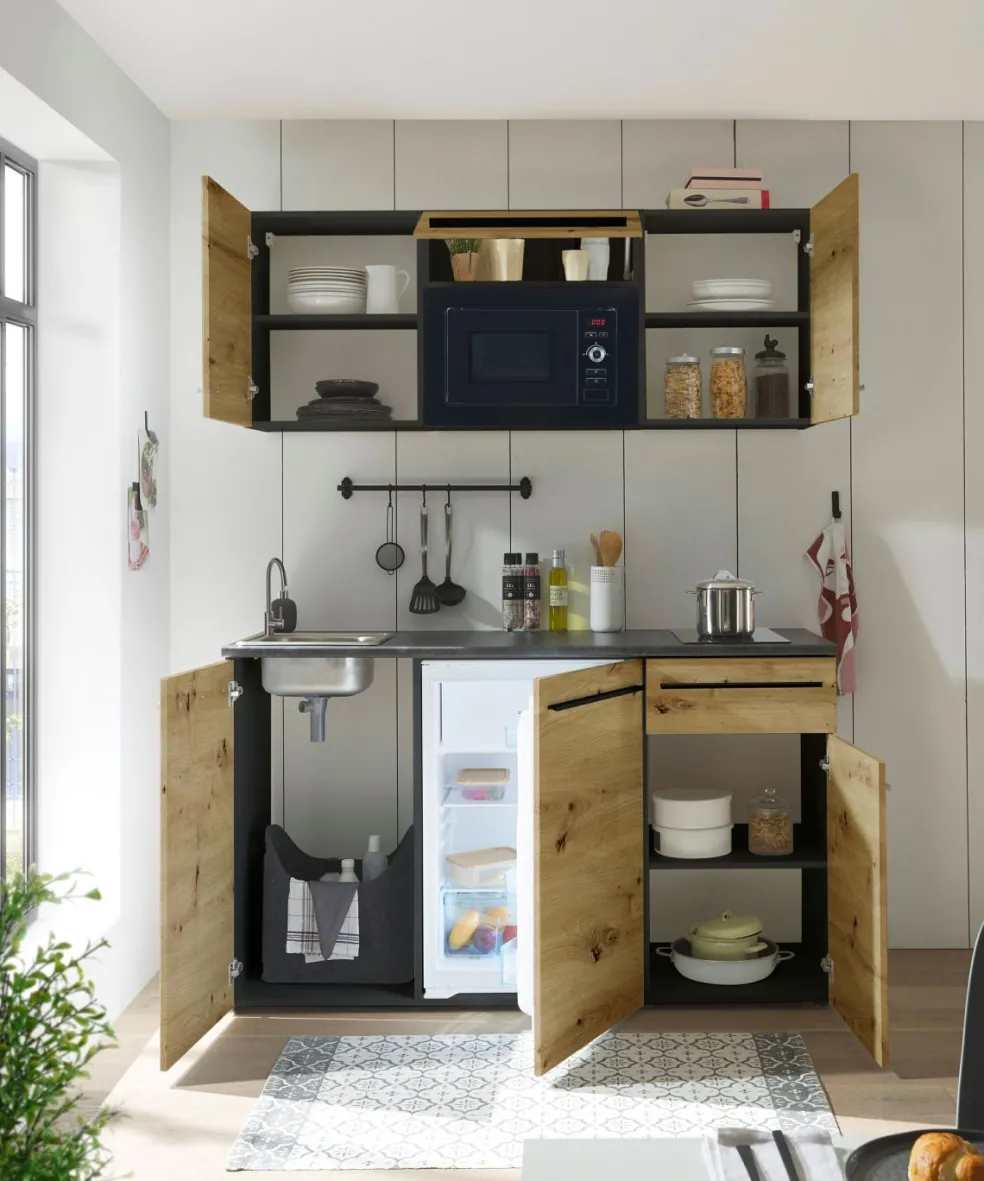 Avec 1 abattant et, derrière lui, 1 casier (au-dessus du micro-ondes)