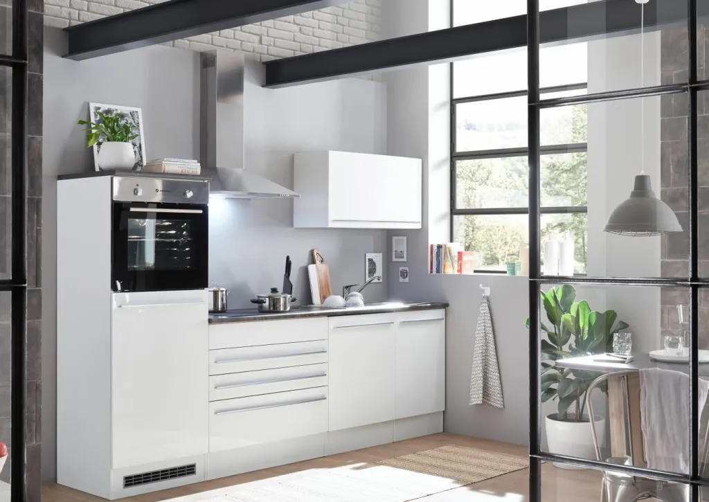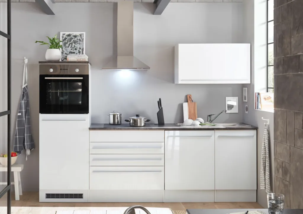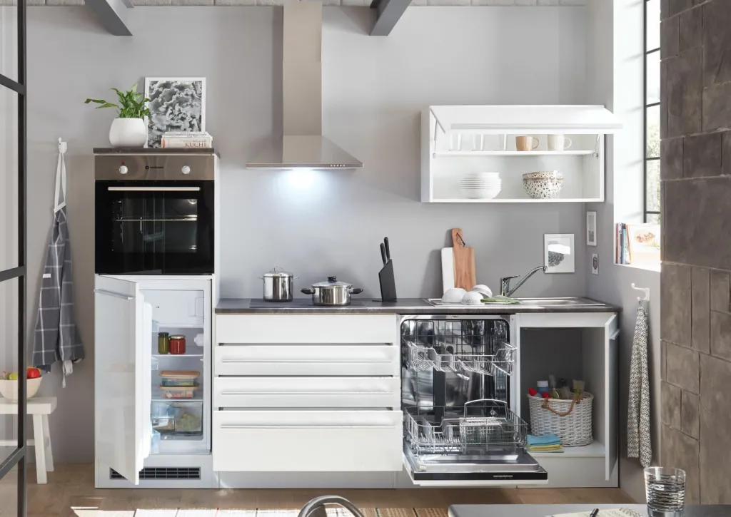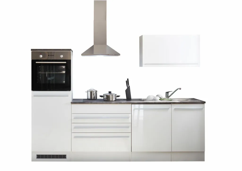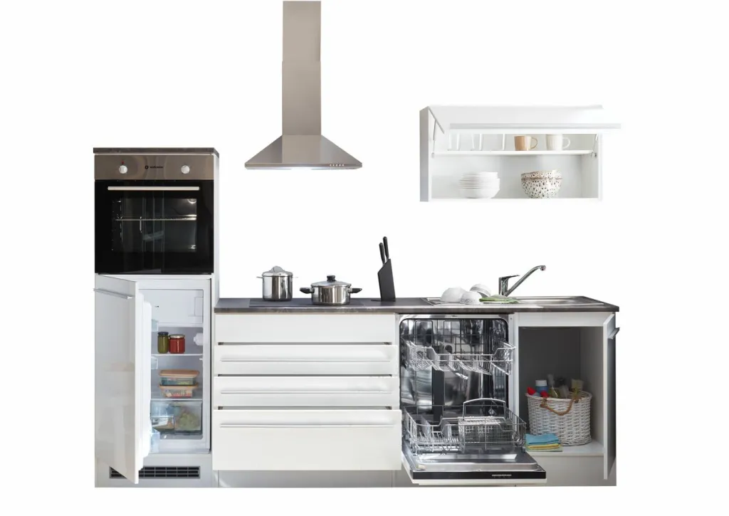 sans décoration / robinetterie / évier / four / plan de cuisson / lave-vaisselle / hotte / réfrigérateur