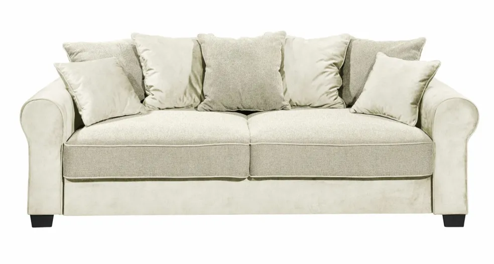 Revêtement : tissu Salvador ton crème 100 % polyester ; assise en tissu Brego 31 ton crème 100 %% polyester ; 3 coussins de dos en tissu Brego 31 ton crème (100 % polyester), 2 coussins de dos en tissu Salvador 01 ton crème (100 % polyester) ; coussin décoratif en tissu Salvador 01 ton crème 100 % polyester