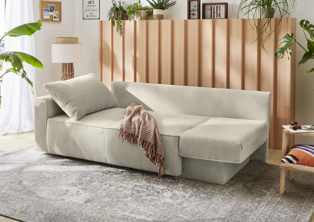 Le canapé se transforme facilement en lit en faisant coulisser l’assise latéralement à l’aide de la dragonne et en basculant l’accoudoir.