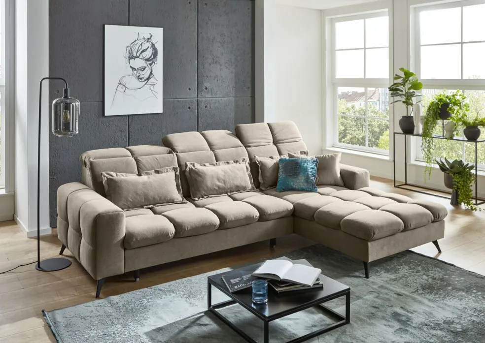 | Equipement canapés: | Appuie-tête(s), Dos habillé, Méridienne à droite, Prolongement de l’assise manuellement, incl. coussins | ||