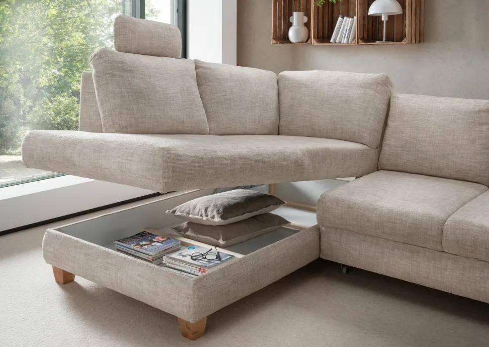 | Equipement canapés: | Appuie-tête(s), Dos habillé, Méridienne à gauche, Prolongement de l’assise manuellement, incl. coffre de lit | ||