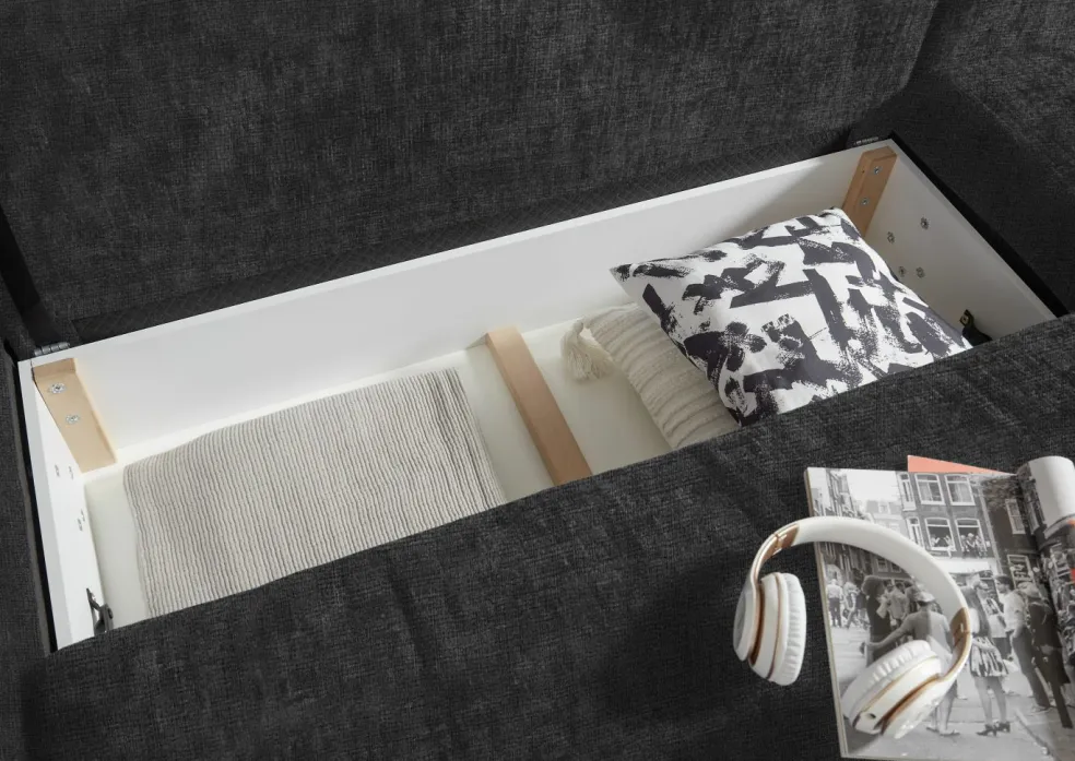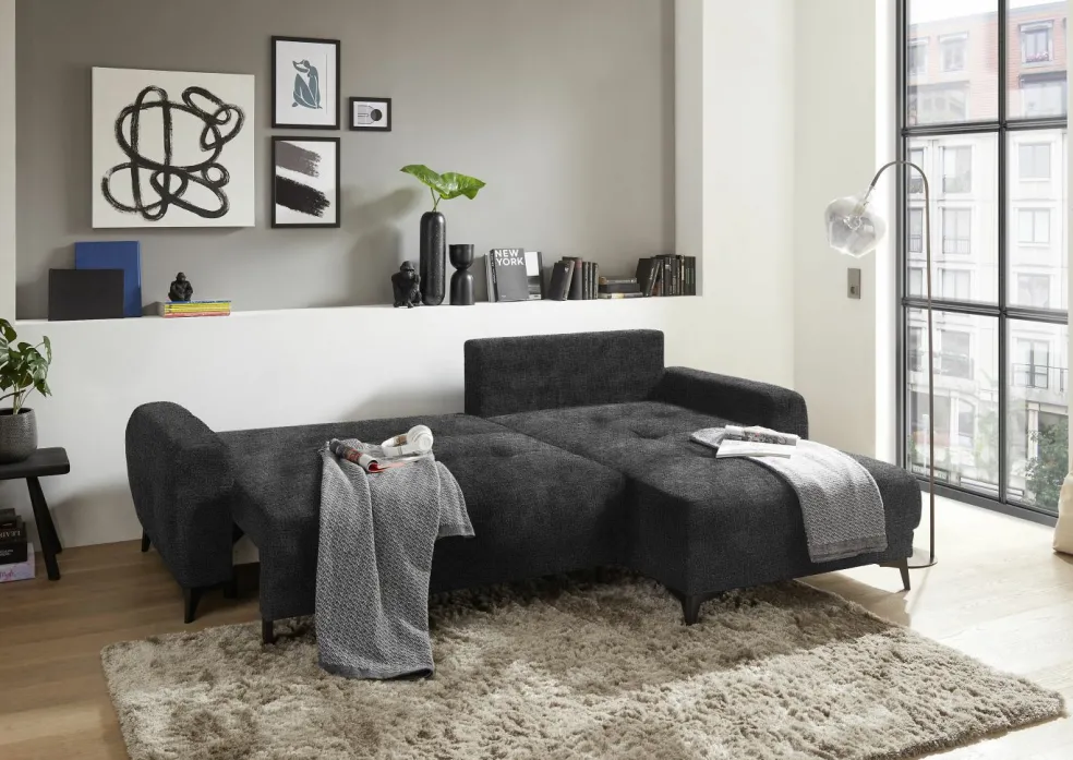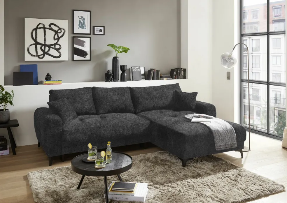 | Equipement canapés: | Dos habillé, Méridienne à droite, incl. coffre de lit, incl. coussins | ||