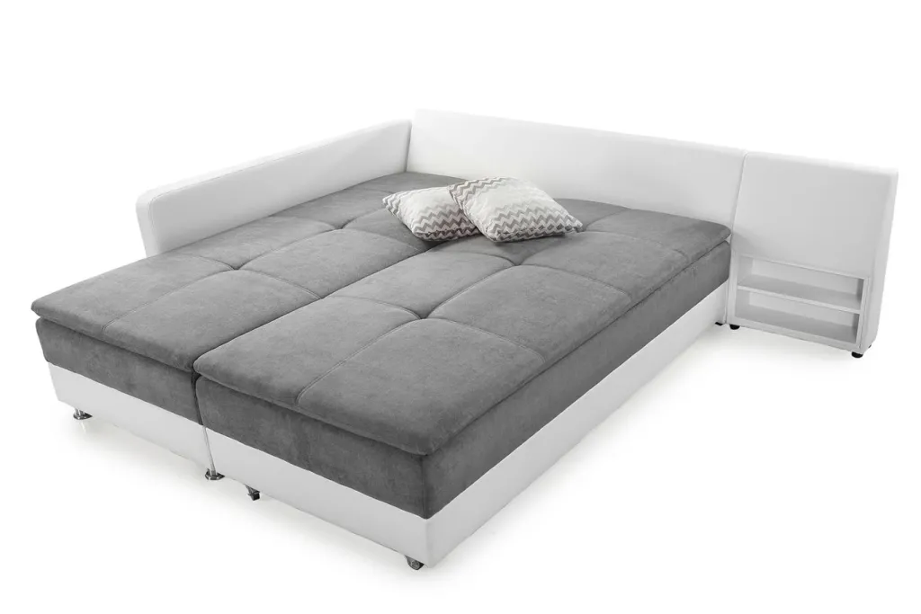 Canapé d’angle ultra tendance avec un garnissage de qualité et système boxspring. Ce canapé peut être utilisé tous les jours comme lit grâce à son garnissage avec suspension nosag et sa surface de couchage 7 zones avec ressorts ensachés en forme de tonneaux. Il garantit un excellent confort d’assise et de couchage grâce à son surmatelas en mousse haute résilience intégré. En faisant pivoter la méridienne, on crée une surface de couchage plus importante. Un chevet pratique avec deux casiers est intégré dans le dossier.