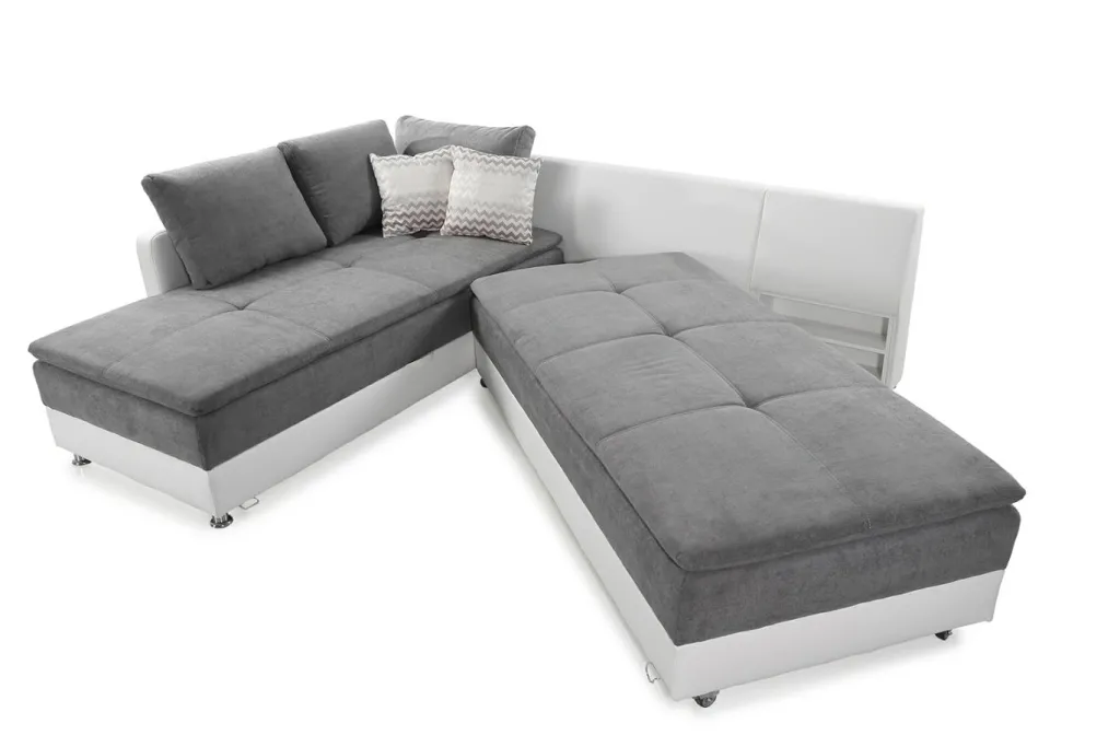 Revêtement : corps en cuir synthétique (100% polyuréthane) coloris blanc ; assise et grands coussins en tissu microfibre ton gris 100% polyester ; petits coussins dans un tissu plat à motifs 100% polyester