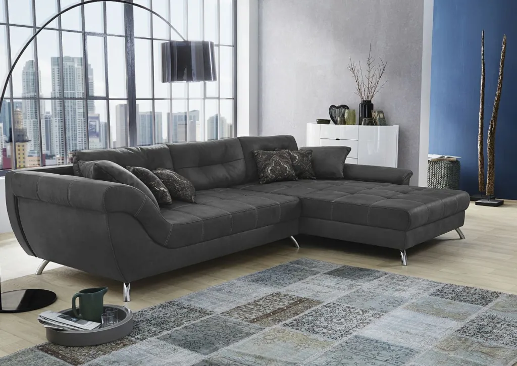 Canapé d’angle ultra tendance aspect nubuck avec une surpiqûre attrayante dans l’assise. Le garnissage de qualité avec suspension nosag, mousse polyéther et couche de mousse haute résilience intégrée garantit un excellent confort d’assise. Grâce à son dos habillé, ce canapé peut être positionné librement dans la pièce.