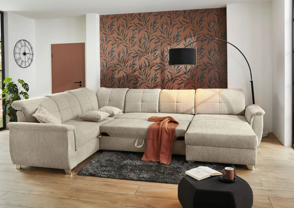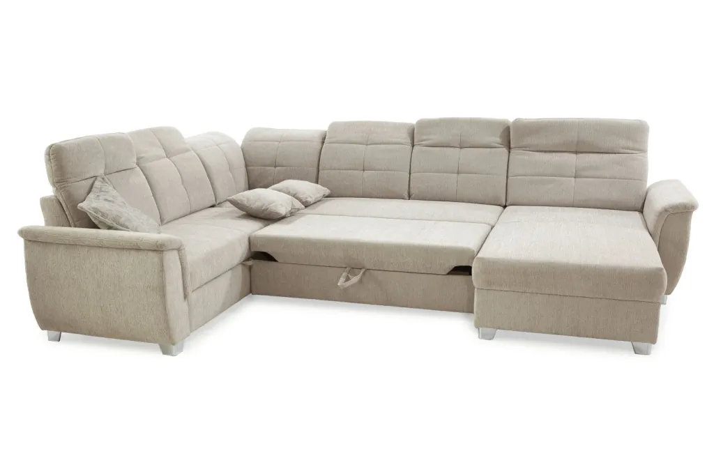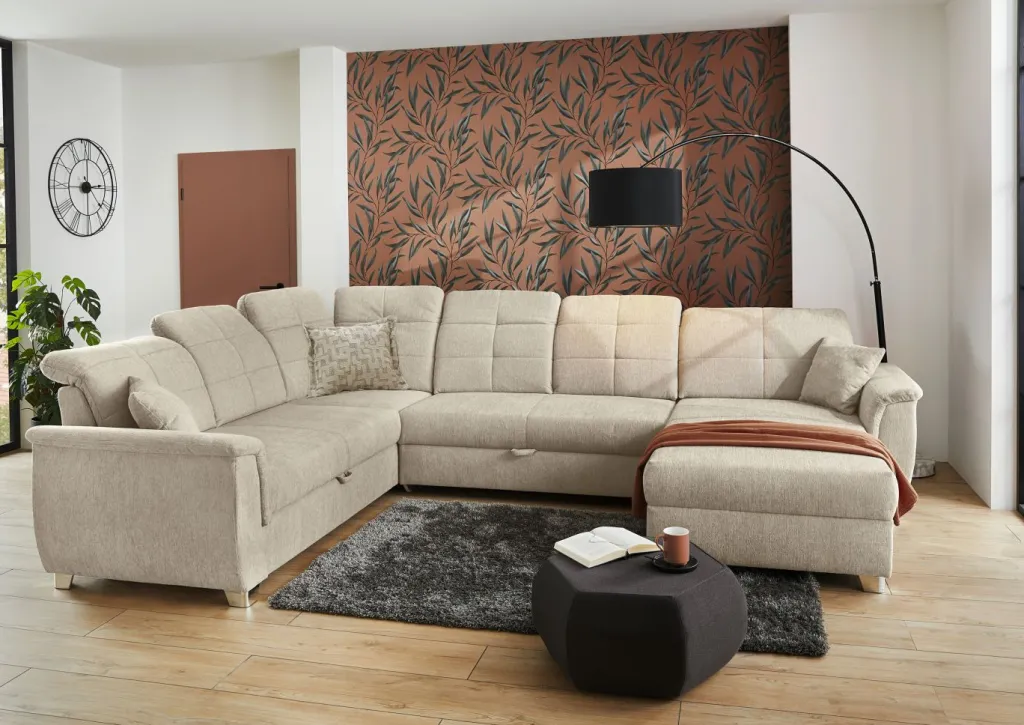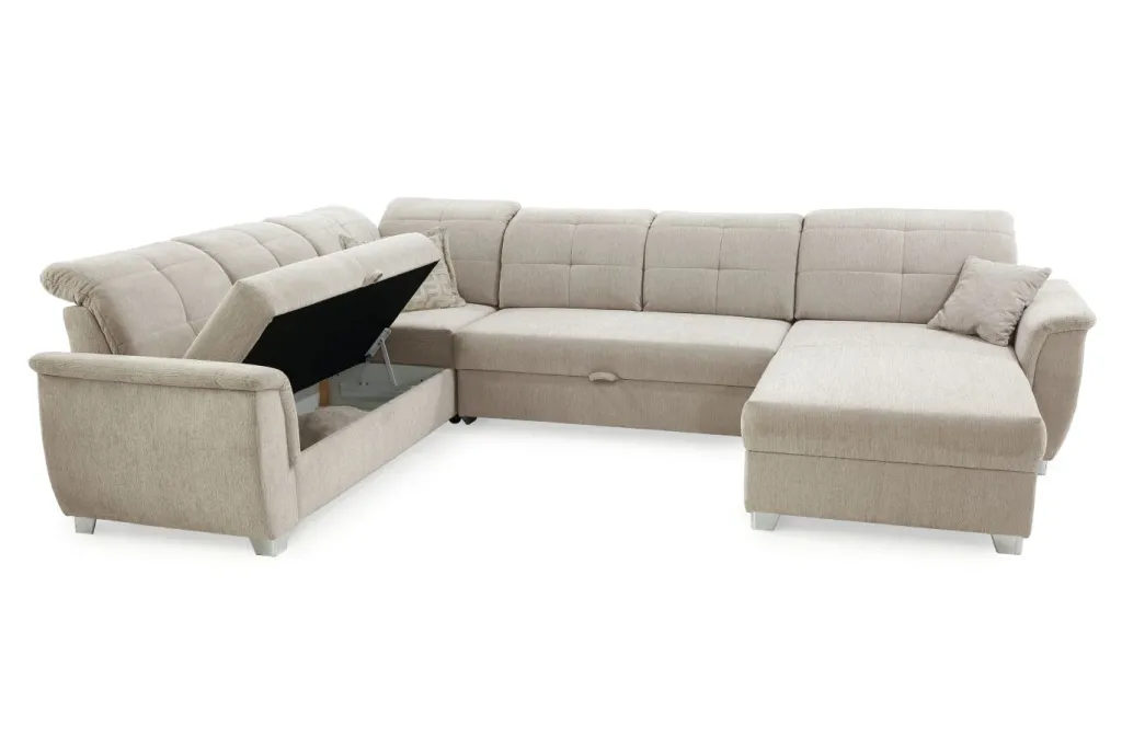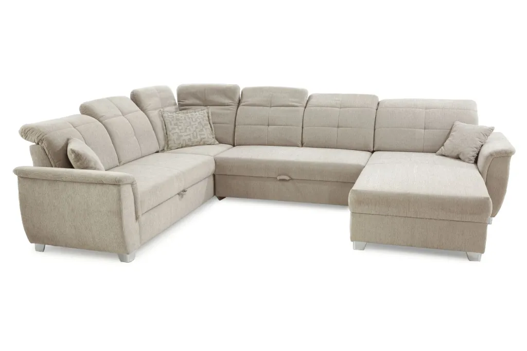 | Equipement canapés: | Dos habillé, Méridienne à droite ou à gauche, incl. coffre de lit, incl. coussins | ||