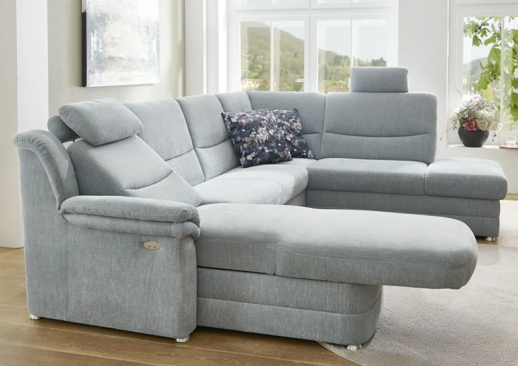 1 méridienne avec fonction électrique et accoudoir à gauche; fonction relax réglable en appuyant sur un bouton ; profondeur réglable jusqu’à la position allongée, env. 199 cm