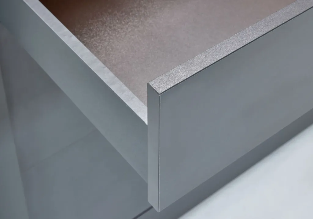 Façade et caisson : panneaux de particules MDF (panneau de fibres de bois de densité moyenne) ton anthracite