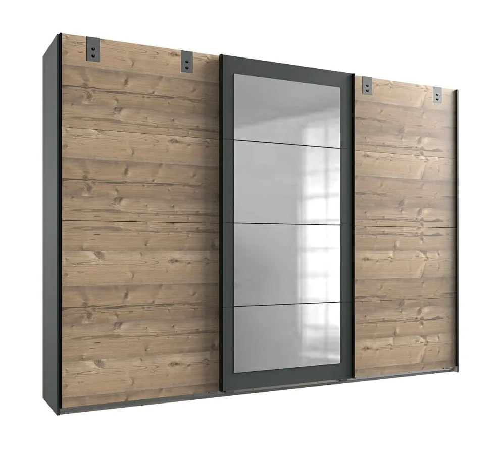 1 armoire 3 portes coulissantes (dont 1 porte miroir) avec 3 tablettes et 3 barres de penderie