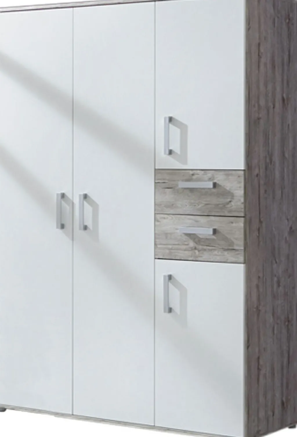 1 armoire à vêtements avec 4 portes et 2 tiroirs ; derrière les 2 portes de gauche se trouvent 1 tablette amovible et 1 barre de penderie ; derrière les deux portes de droite, on trouve, à chaque fois, 1 tablette amovible