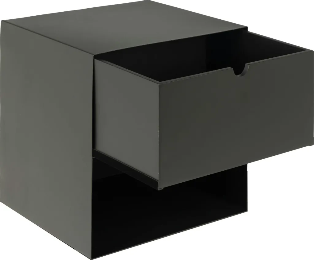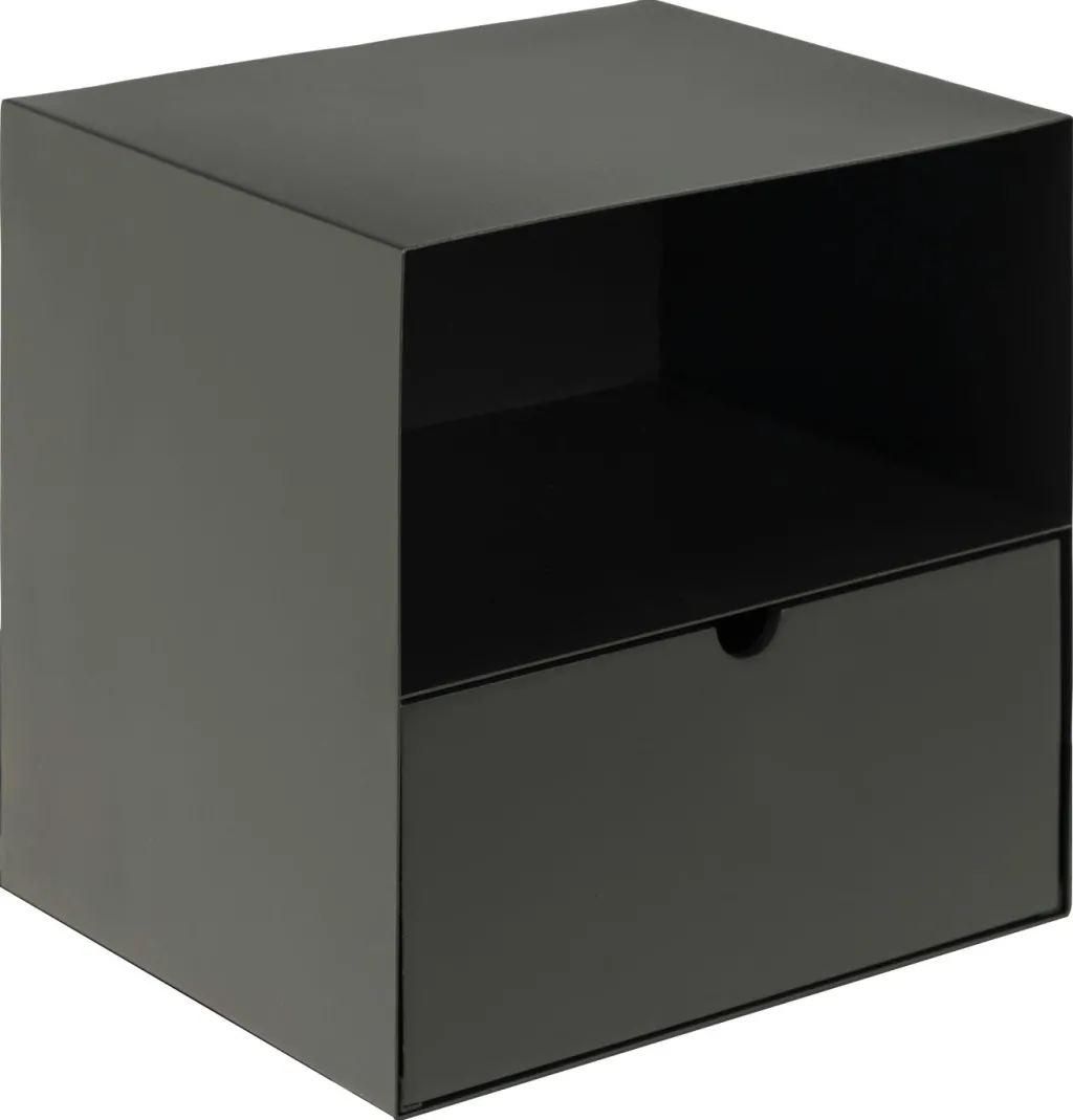 Caisson et façade : métal finition époxy aspect rugueux ton noir mat et un tiroir en MDF (panneau de fibres de bois de densité moyenne) ton noir