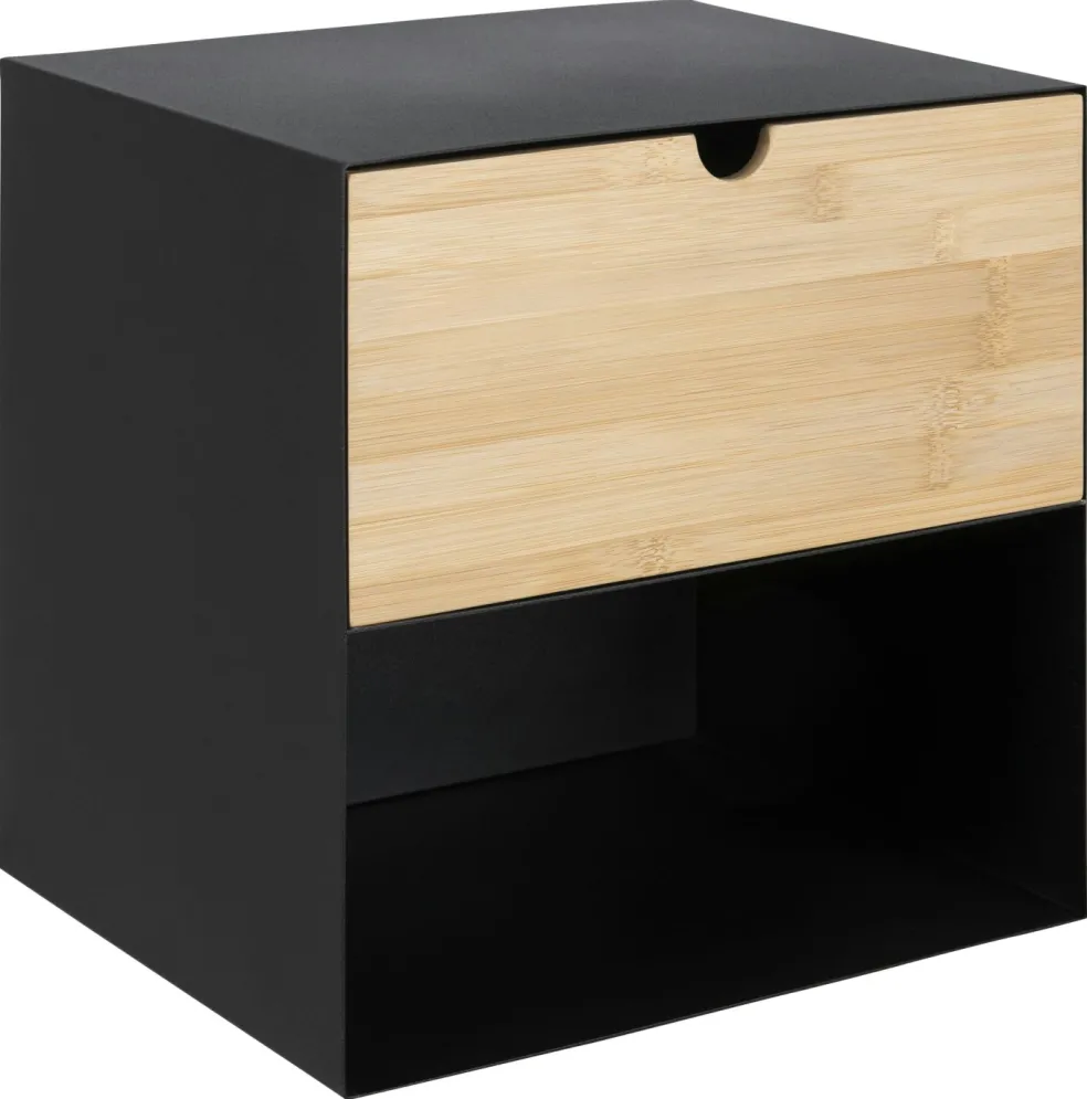 Caisson et façade : métal finition époxy aspect rugueux ton noir mat et un tiroir en bambou massif (Chine) avec couche de laque NC