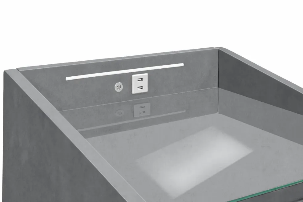 | Équipement Commodes Phono Bureau Étagère: | Plateau en verre, Tiroirs, avec port USB, incl. éclairage | ||