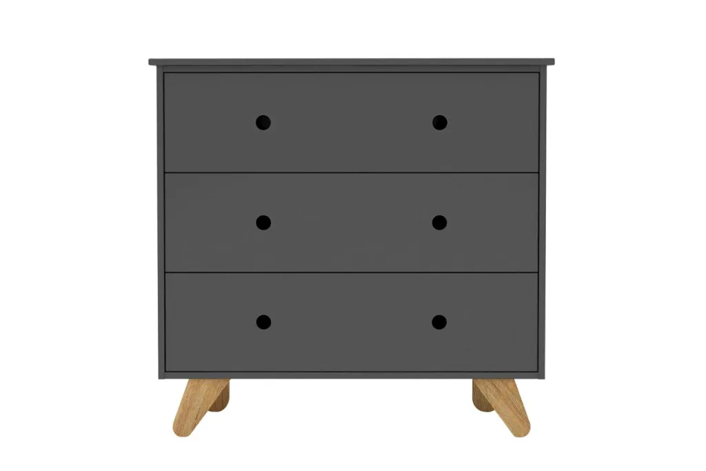 Commode : MDF (panneau de fibres de bois de densité moyenne) ton gris laqué en vernis acrylique