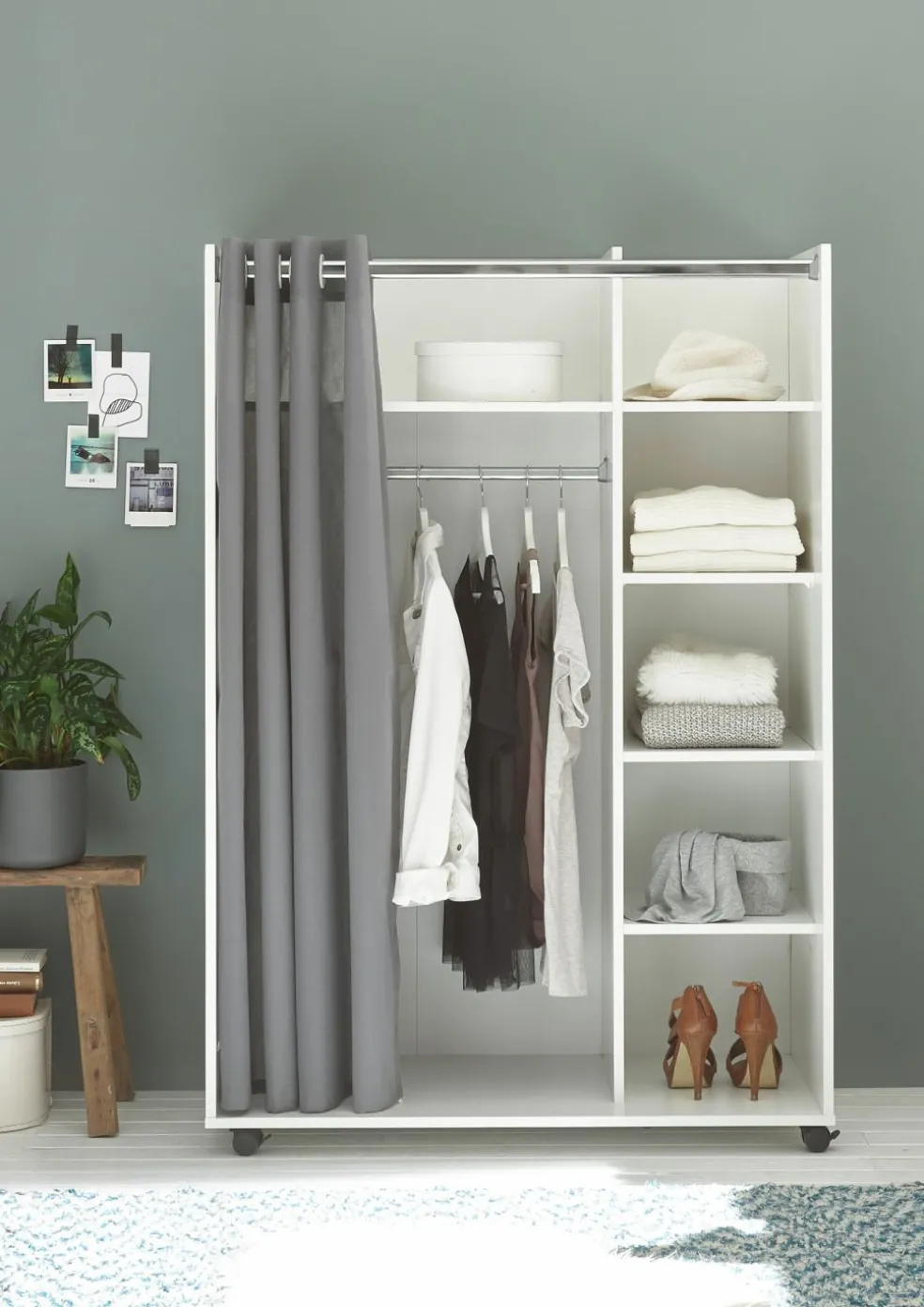 Répartition intérieure : 1 paroi médiane ; à gauche : 1 tablette et 1 barre de penderie, à droite : 4 tablettes