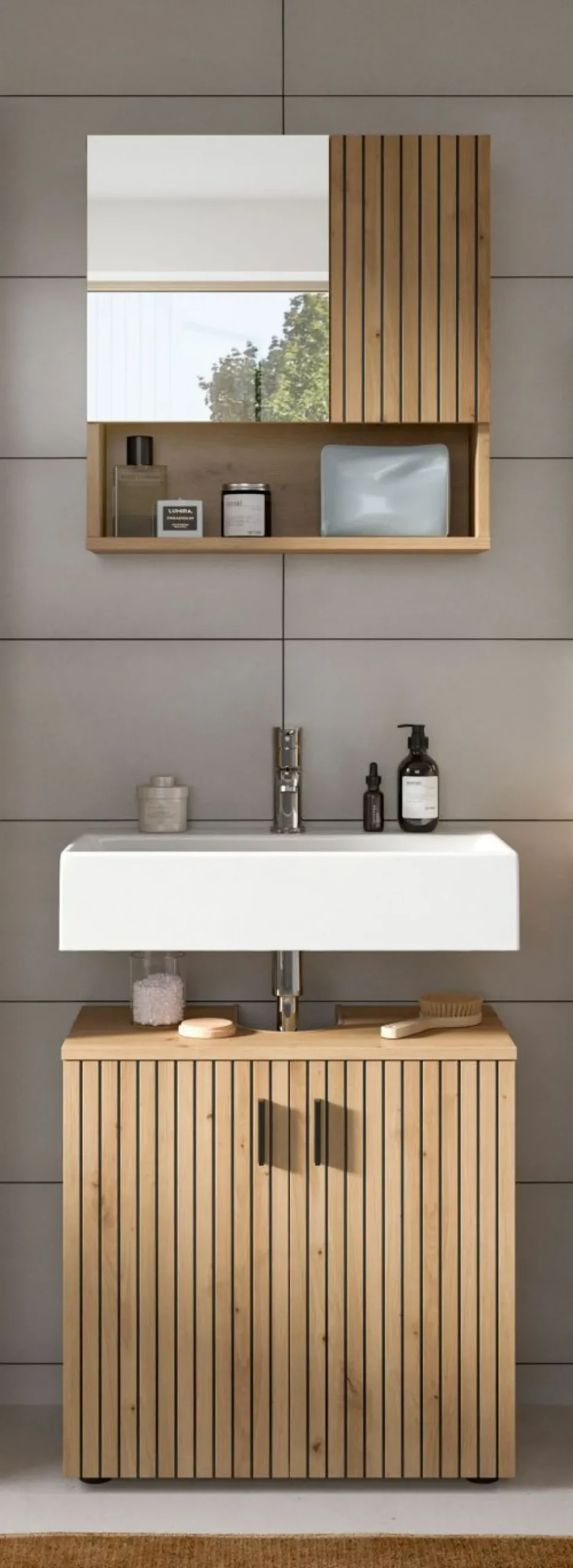1 armoire de toilette avec 2 portes (dont 1 porte miroir), 2 tablettes amovibles et 1 casier ouvert