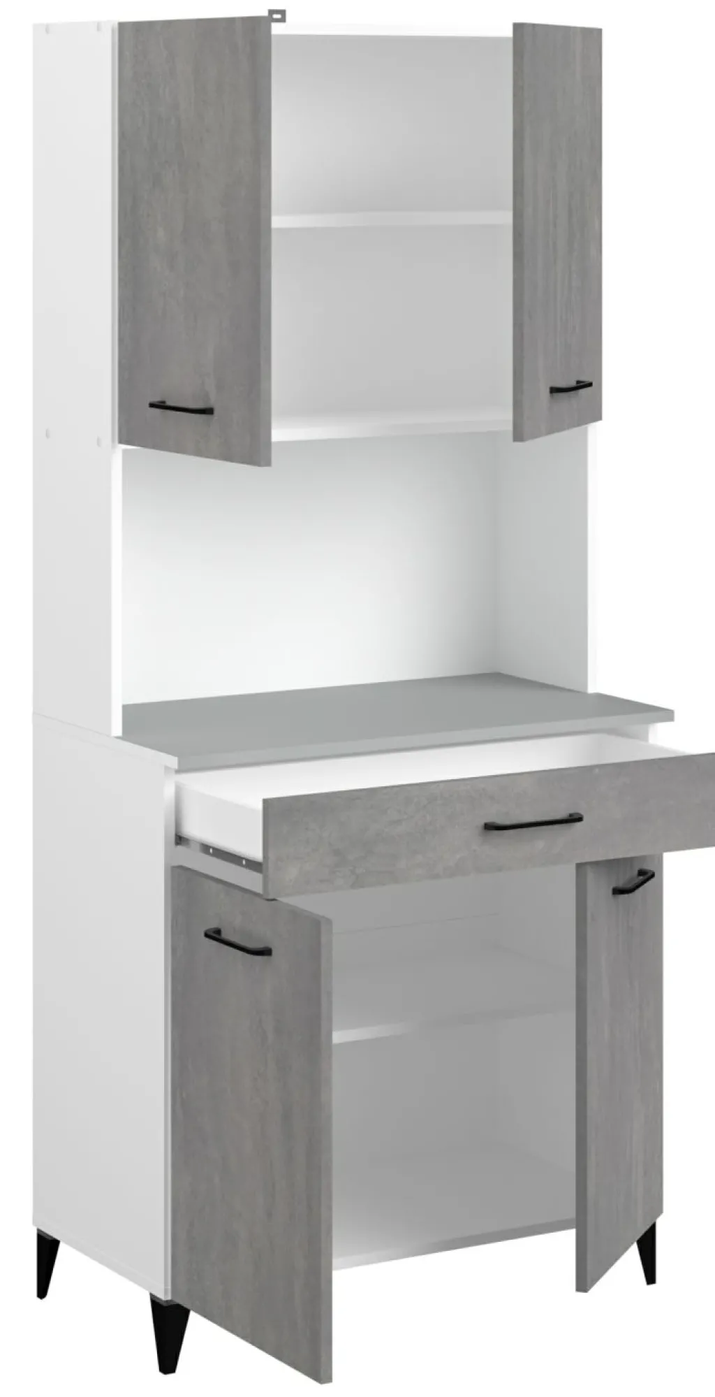 En bas : 1 tiroir avec, en dessous, 2 portes et, derrière elles, 2 casiers