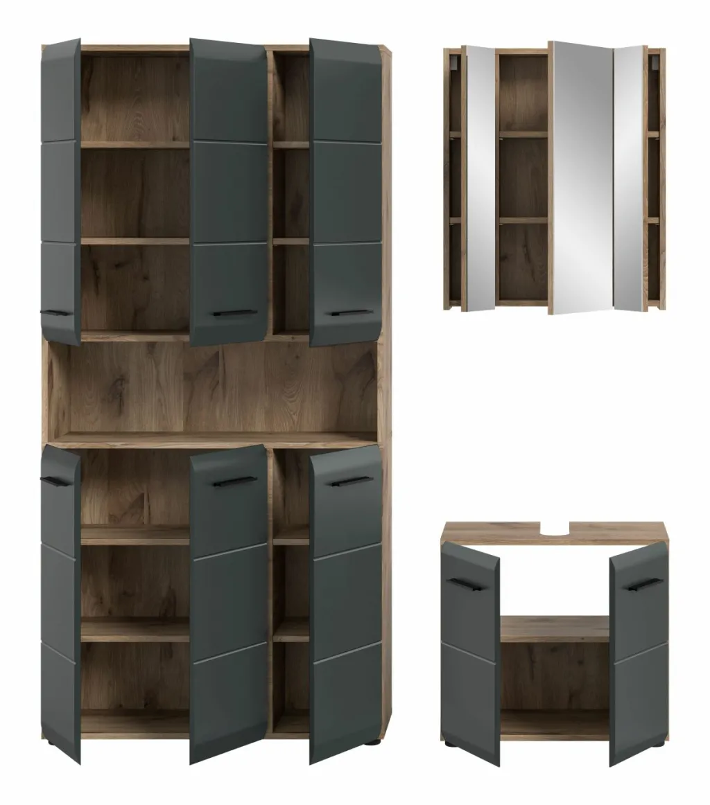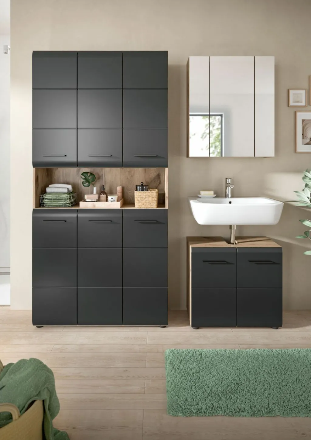 1 armoire de salle de bains avec 6 portes, 8 tablettes amovibles et 1 casier ouvert