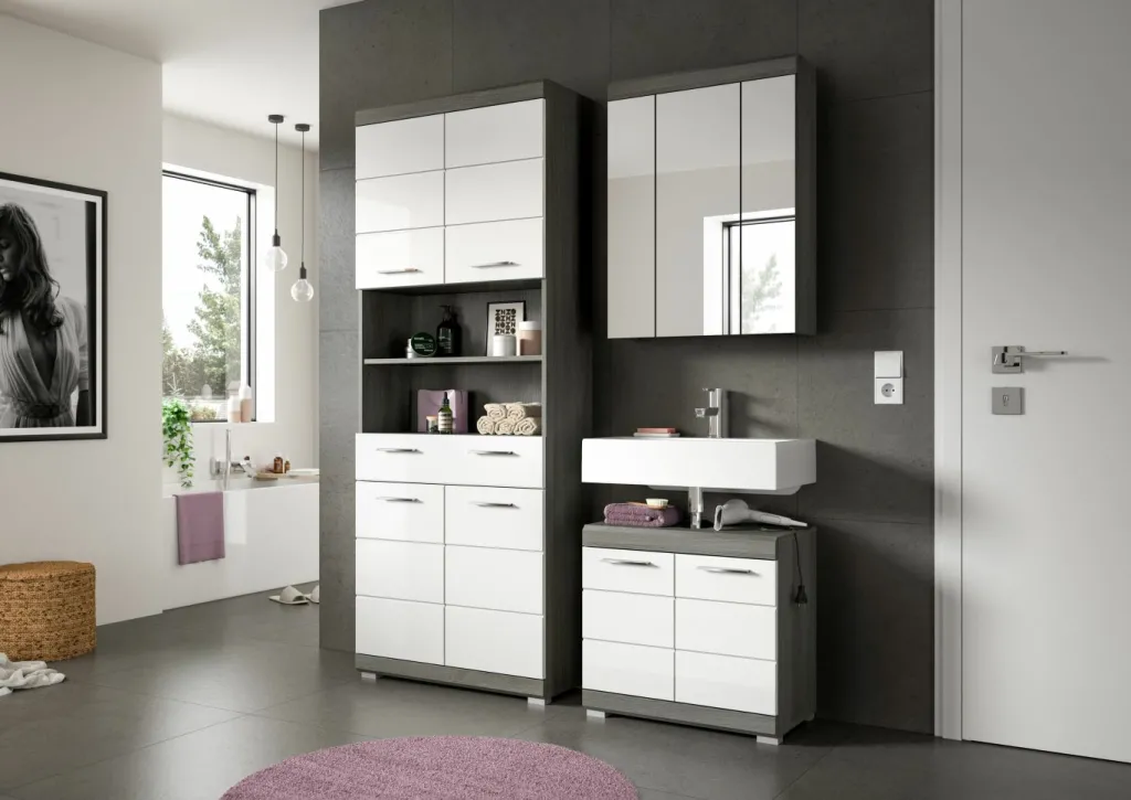 1 armoire de toilette avec 3 portes et 6 tablettes amovibles