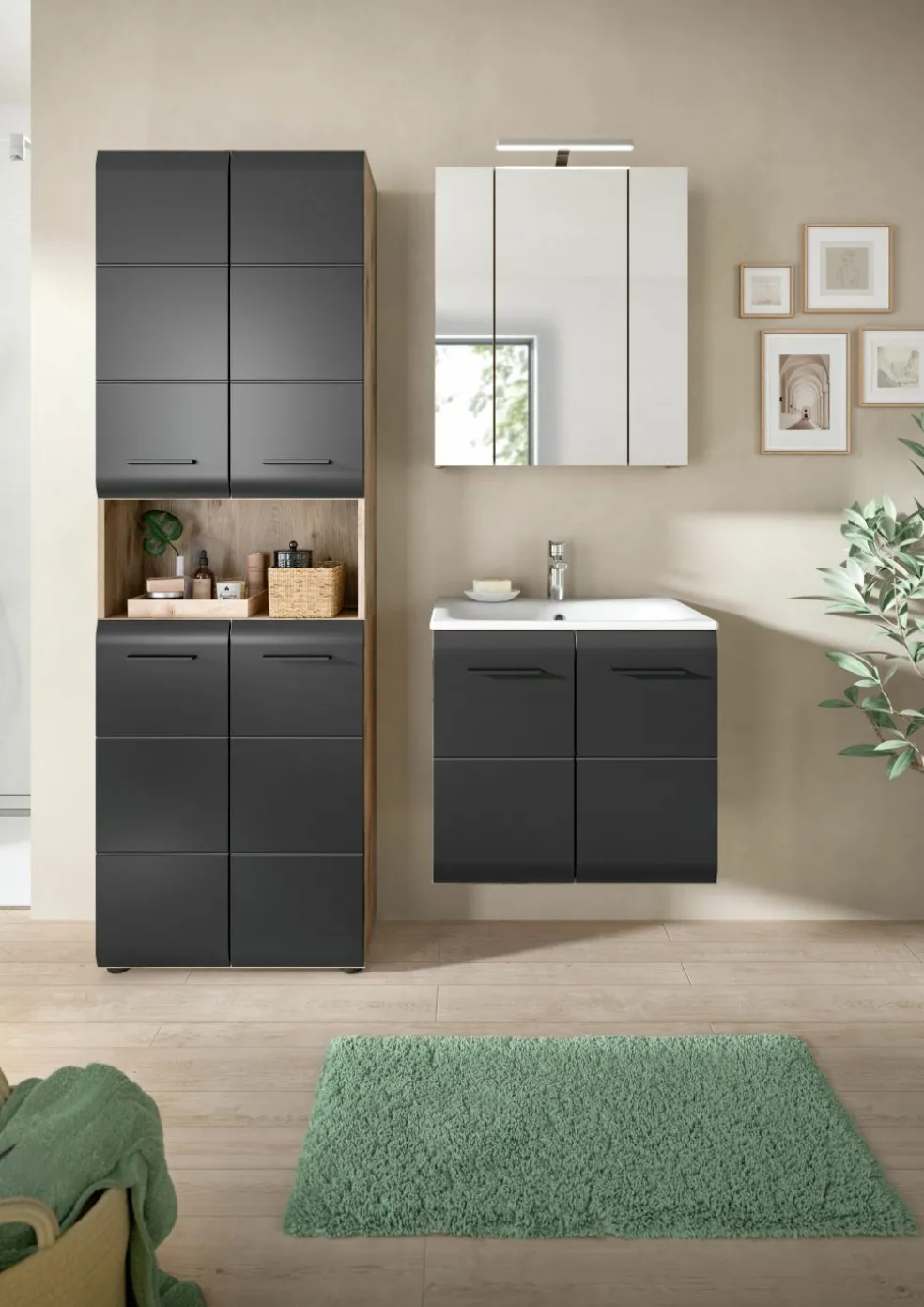 1 armoire de salle de bains avec 4 portes, 4 tablettes amovibles et 1 casier ouvert
