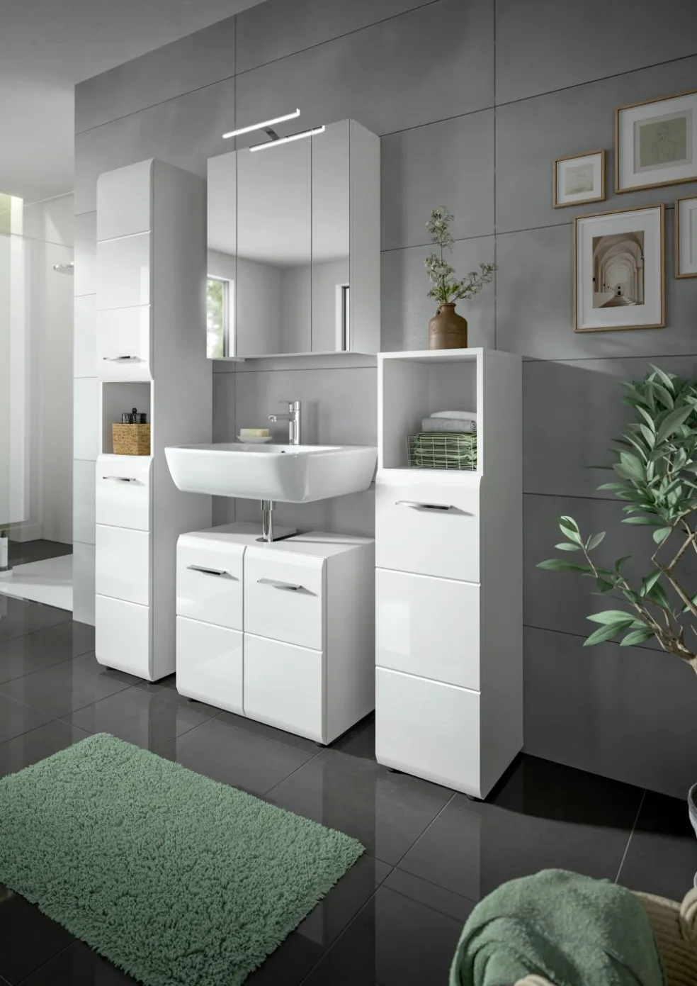 1 colonne de salle de bains avec 2 portes, 4 tablettes amovibles et 1 casier ouvert