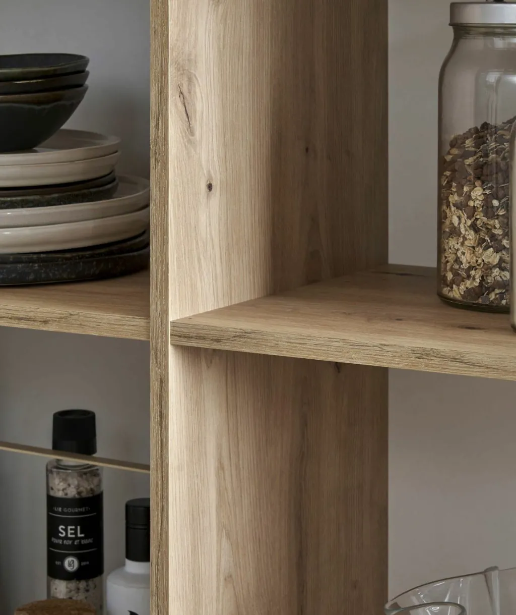 Caisson : ton blanc, contrastes : décor chêne Artisan, panneau de particules surfacé mélaminé (PPSM)
