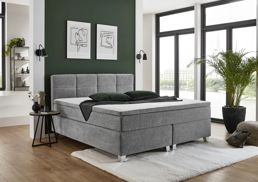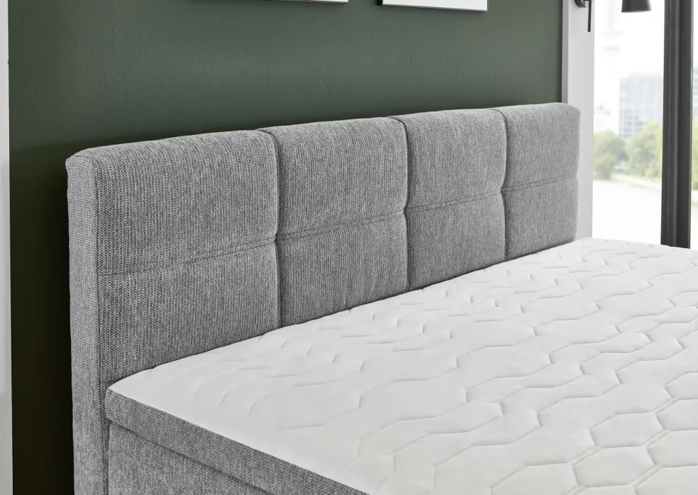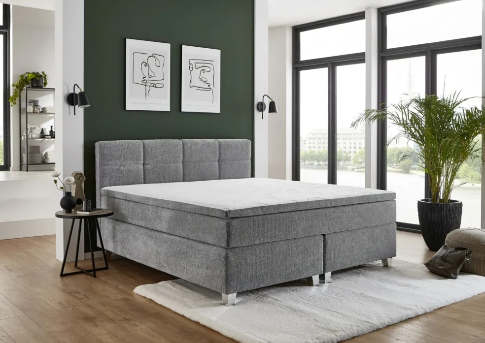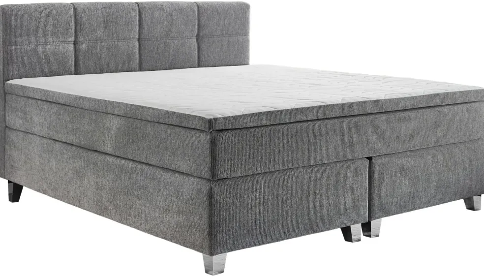 Revetement : lit boxspring en tissu 50530-720 couleur argent, 100 % polyester ; surface de couchage/double toile 100 % polyester
