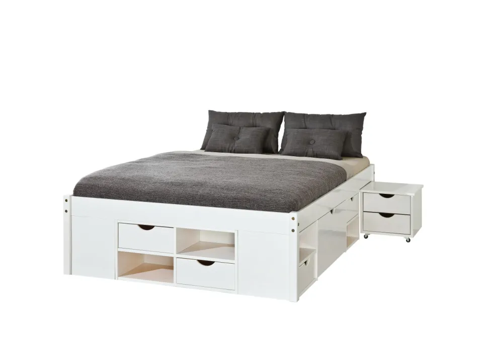 - Lit bien pensé avec un système de rangement ultra pratique : quatre tiroirs, huit casiers et deux chevets à roulettes pouvant se ranger sous le lit